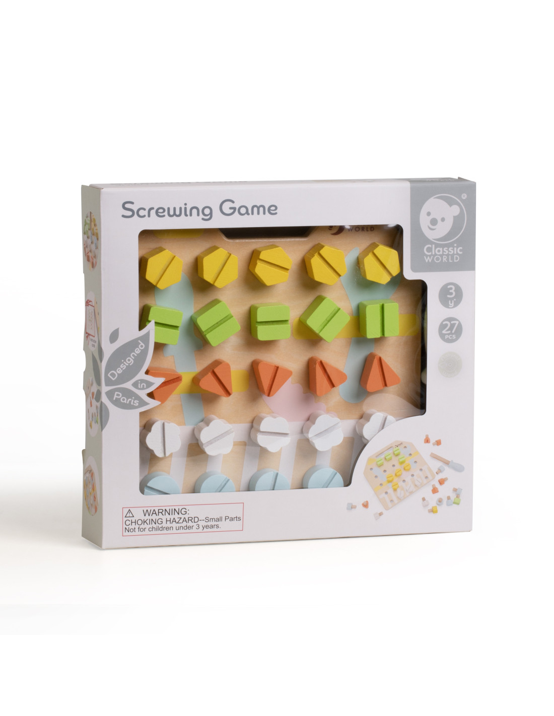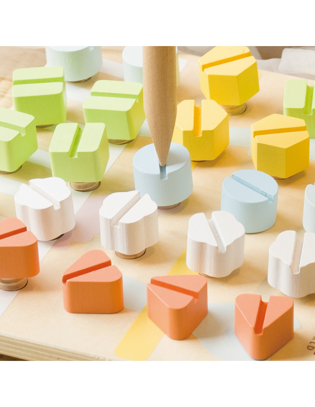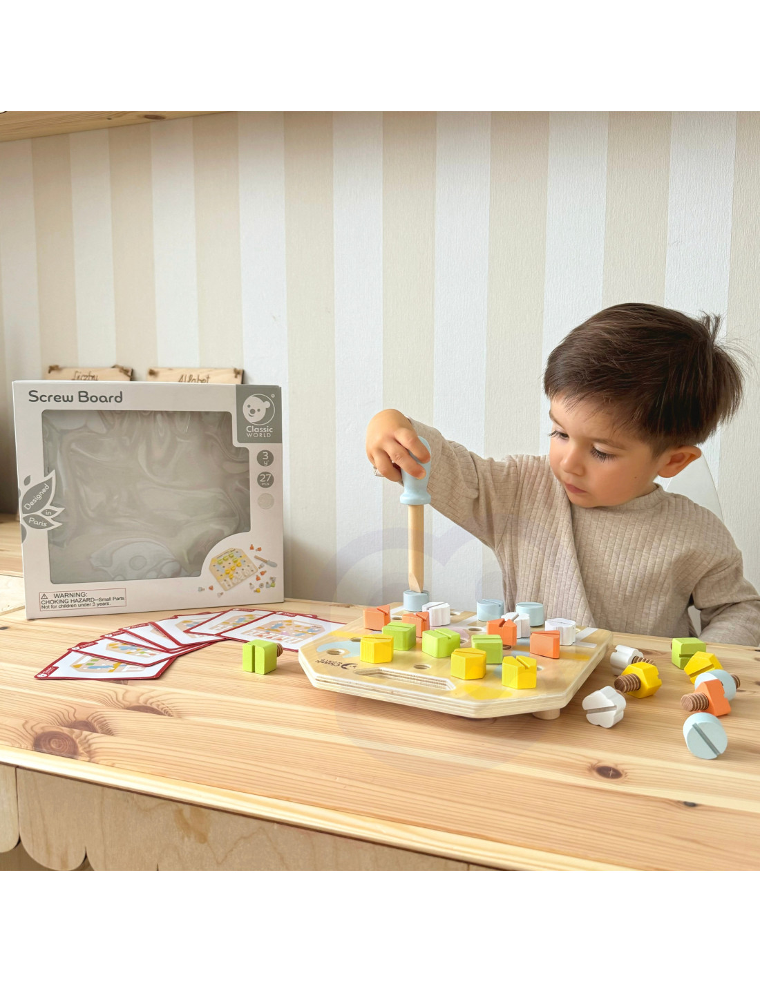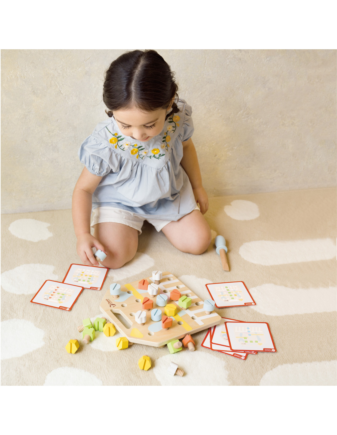 Dzieci rozwijają koordynację, koncentrację oraz siłę nadgarstka i dłoni poprzez wkręcanie. Karty testowe które zawierają gotowe wzory wzbogacają rozgrywkę. Dzieci mogą również bawić się z rodzicami w zapamiętywanie wzorów ułożonych przez rodziców. Maluchy mogą poprawić swoją zdolność rozpoznawania i rozróżniania kolorów i kształtów oraz wzmocnić umiejętności motoryczne.
