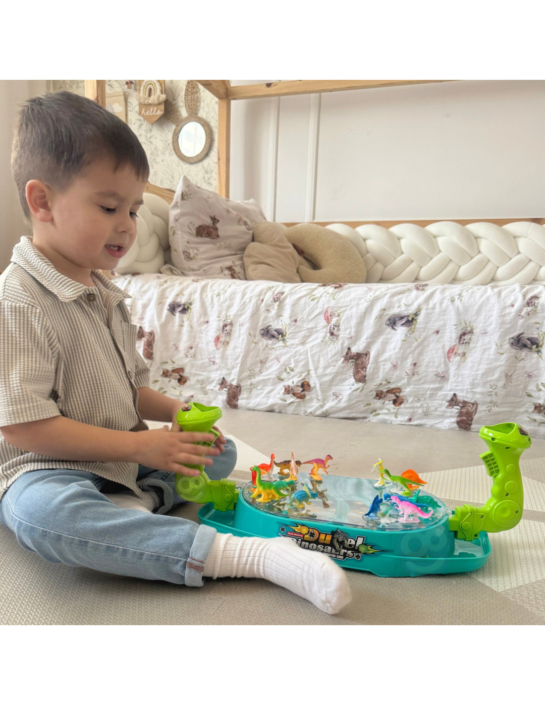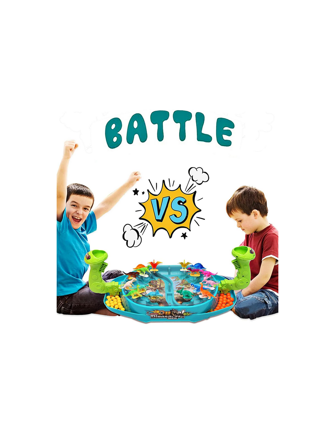 Bitwa Dinozaurów to gra zręcznościowa od marki Woopie. Ta dwuosobowa strzelanka w dinozaury znacznie poprawi zdolności koordynacyjne. Rozłóż dinozaury na planszy w odpowiednich miejscach. Wrzuć kulki do uchwytu i pociągnij za spust aby zbić dinozaury. Wygrywa gracz, który szybciej zbije kulkami dinozaury z planszy przeciwnika. Zestaw zawiera planszę do gry w plastikowa osłoną, która uniemożliwia wypadanie kulek za zewnątrz, 16 szt. kolorowych dinozaurów oraz 24 szt. kulek w dwóch kolorach.