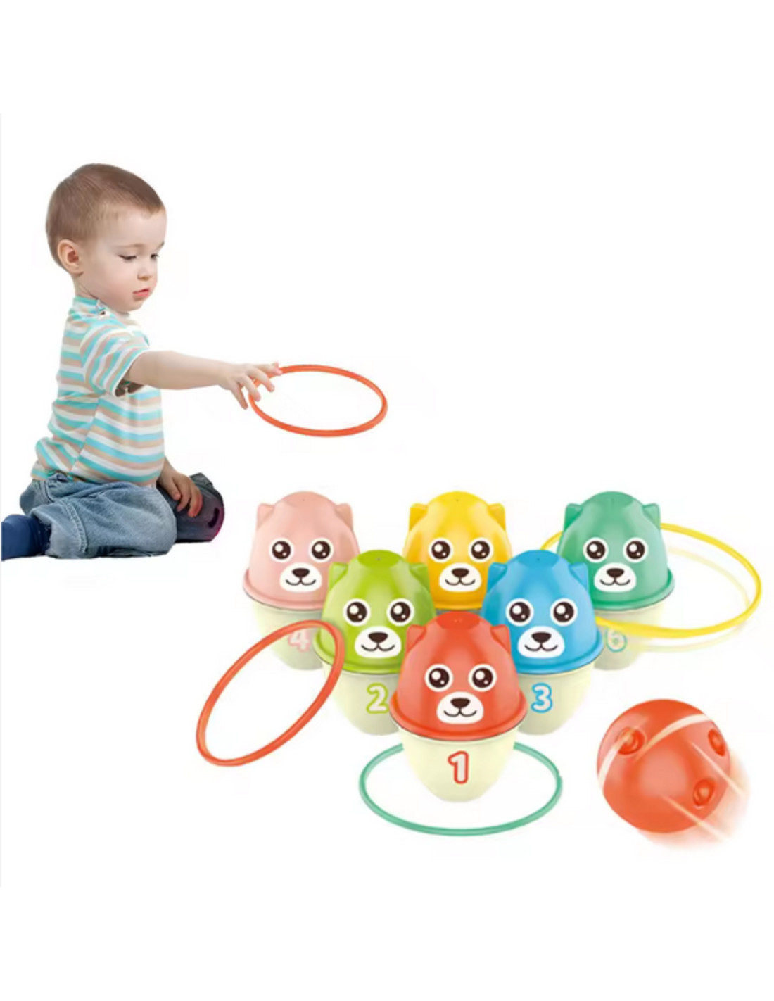 Kręgle dla dzieci Kolorowe Misie od Woopie to innowacyjna, edukacyjna zabawka, która łączy radość z zabawy w kręgle z nauką przez działanie. Zestaw składa się z kolorowych misiów z numerkami, które pełnią rolę kręgli, a także z piłeczek do zbijania i obręczy do rzucania, co daje wiele różnych możliwości zabawy. Każdy miś ma inny kolor i numer, co pozwala dziecku na naukę rozpoznawania barw oraz cyferek. Rzucając piłką lub obręczami na misie, dziecko ćwiczy koordynację ręka–oko, precyzję ruchów oraz planowanie swoich działań. Dzięki atrakcyjnej formie i różnorodnym funkcjom, zestaw doskonale nadaje się zarówno do samodzielnej zabawy, jak i do wspólnego spędzania czasu z rodzicami czy rówieśnikami. Zabawka została wykonana z trwałych, bezpiecznych dla dzieci materiałów, które są przyjemne w dotyku i odporne na uszkodzenia. Miśki można również układać w wieżę, wkładając je jeden w drugi niczym kubeczki. Różne tryby gry – rzucanie obręczami, zbijanie kręgli, liczenie cyferek – sprawiają, że maluch nie tylko świetnie się bawi, ale i intensywnie się uczy. To doskonały prezent dla każdego dziecka, który gwarantuje nie tylko uśmiech, ale także aktywny rozwój zdolności poznawczych, manualnych i społecznych. Idealny do domu, żłobka, przedszkola czy na rodzinne wyjazdy.