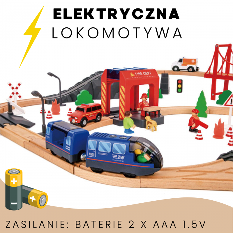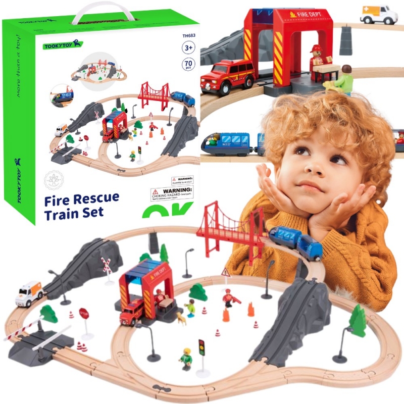 Zestaw kolejowy Drewniana kolejka Straż Pożarna marki Tooky Toy to dynamiczny świat akcji, w którym pociąg ratunkowy pędzi przez most, tunele i remizę, by zdążyć z pomocą na czas. Dziecko wciela się w rolę dzielnych strażaków, kierowców i ratowników, odgrywając własne historie, ćwicząc wyobraźnię i tworząc całe miasto na drewnianych torach. Solidne elementy, intensywne kolory, efekty dźwiękowe i mnóstwo ruchomych pojazdów sprawiają, że zabawa w ratunek staje się ulubioną codzienną przygodą malucha.