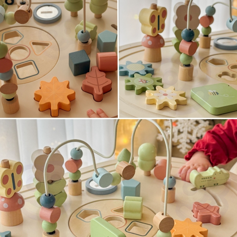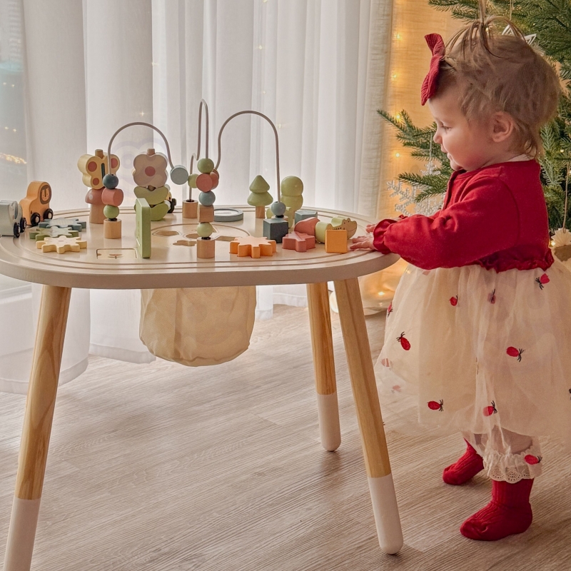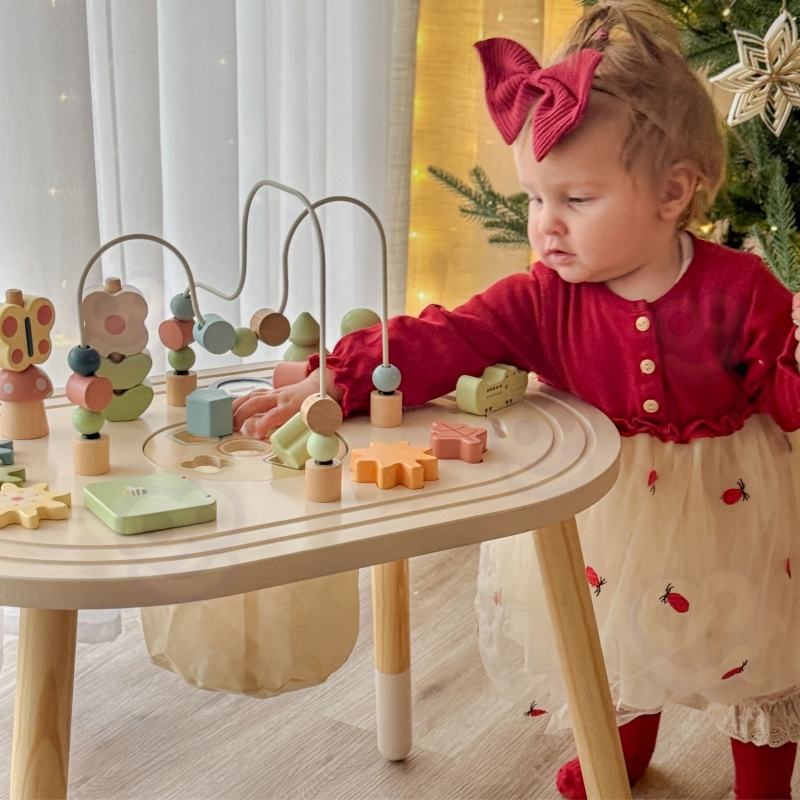 Ten uroczy drewniany stolik edukacyjny to idealna propozycja dla najmłodszych odkrywców świata! Ten stolik to prawdziwy skarb dla malucha – od razu wciąga go w świat kolorów, kształtów i radosnych dźwięków, a przy tym rozwija mnóstwo ważnych umiejętności. Pozwól swojemu dziecku swobodnie odkrywać i uczyć się w bezpiecznym otoczeniu, gdzie każdy dotyk i każda próba dopasowania to mały sukces. To idealny przyjaciel na długie godziny zabawy, który rośnie razem z dzieckiem i nigdy się nie nudzi.