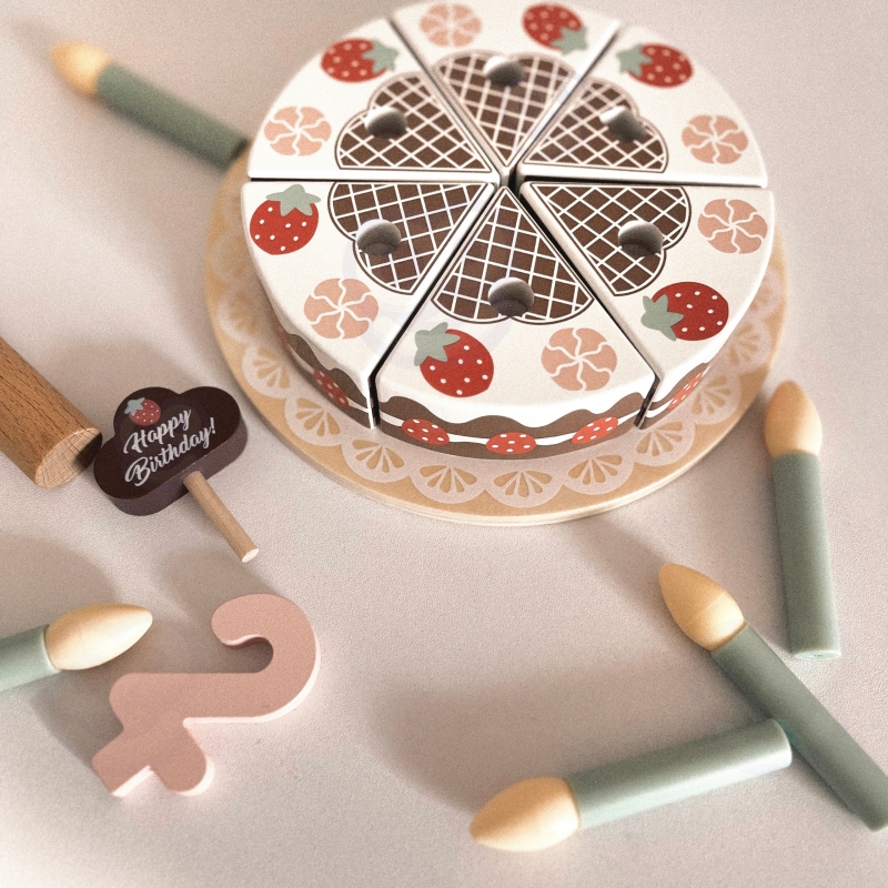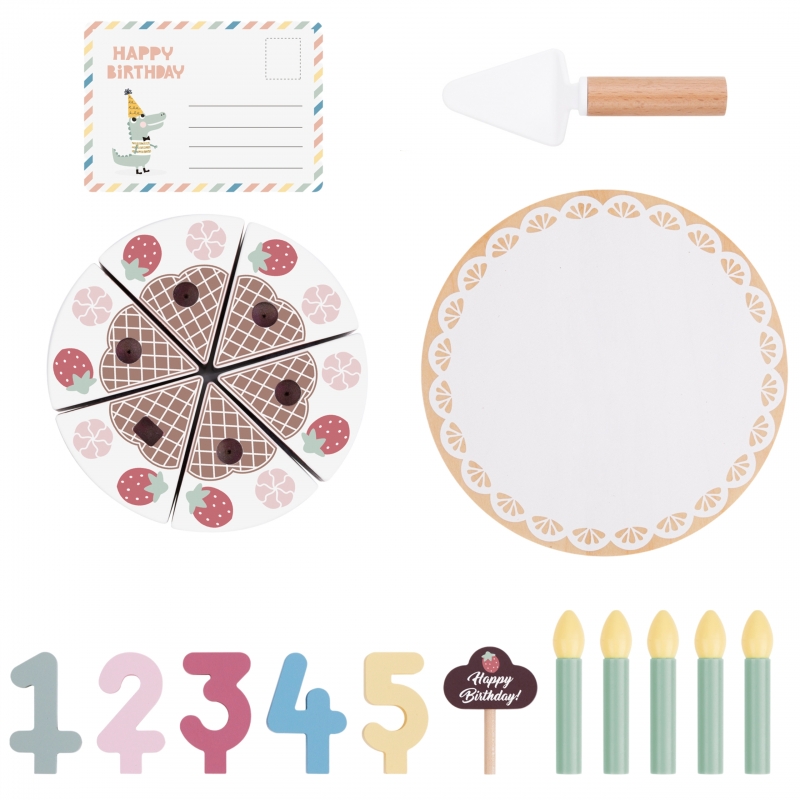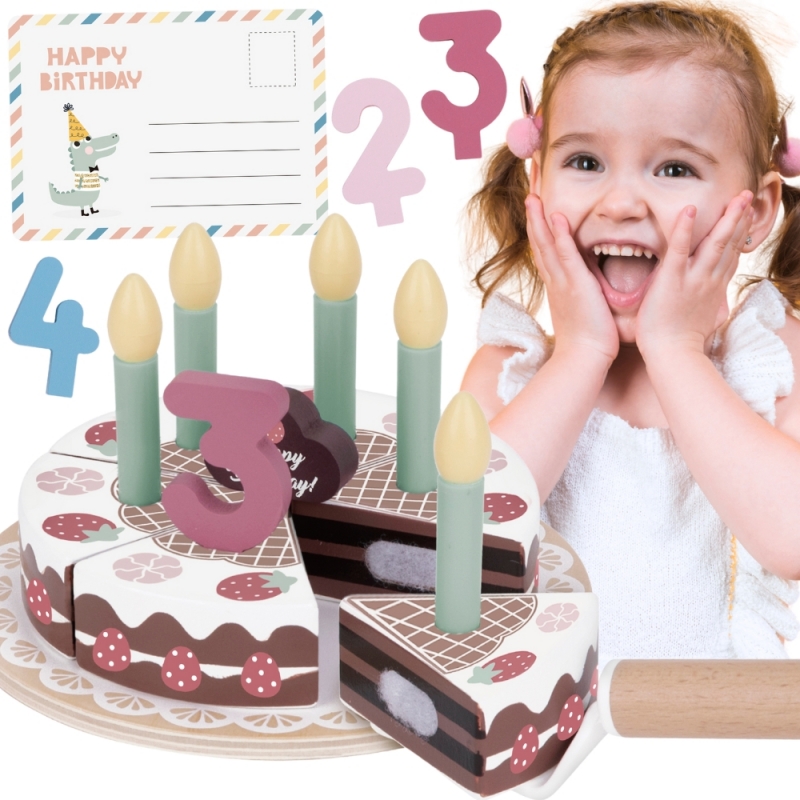 Drewniany Piękny Czekoladowy Urodzinowy Tort z truskawkami i bezami marki Tooky Toy to nie tylko uroczy dodatek do dziecięcej kuchni, ale także doskonały element dekoracyjny na przyjęciu urodzinowym. Składa się z 20 starannie wykonanych drewnianych elementów, każdy fragment tortu łączy się ze sobą za pomocą wytrzymałych rzepów, zapewniając solidną konstrukcję. Dodatkowo zestaw zawiera świeczki, cyfry od 1 do 5, kartkę urodzinową oraz specjalną łyżkę do ciasta.