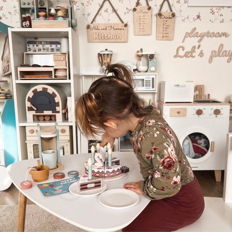 Ta wyjątkowa zabawka nie tylko rozwija kreatywność poprzez odgrywanie ról w kuchni, ale także wspiera rozwój umiejętności manualnych, społecznych oraz motoryki małej. Idealna dla małych kucharzy, zachęcająca do twórczej zabawy i nauki poprzez symulowanie przygotowania pysznych tortów. Niech twoje dziecko odkryje radość kreatywnej zabawy i rozwija umiejętności poprzez ten uroczy drewniany tort.