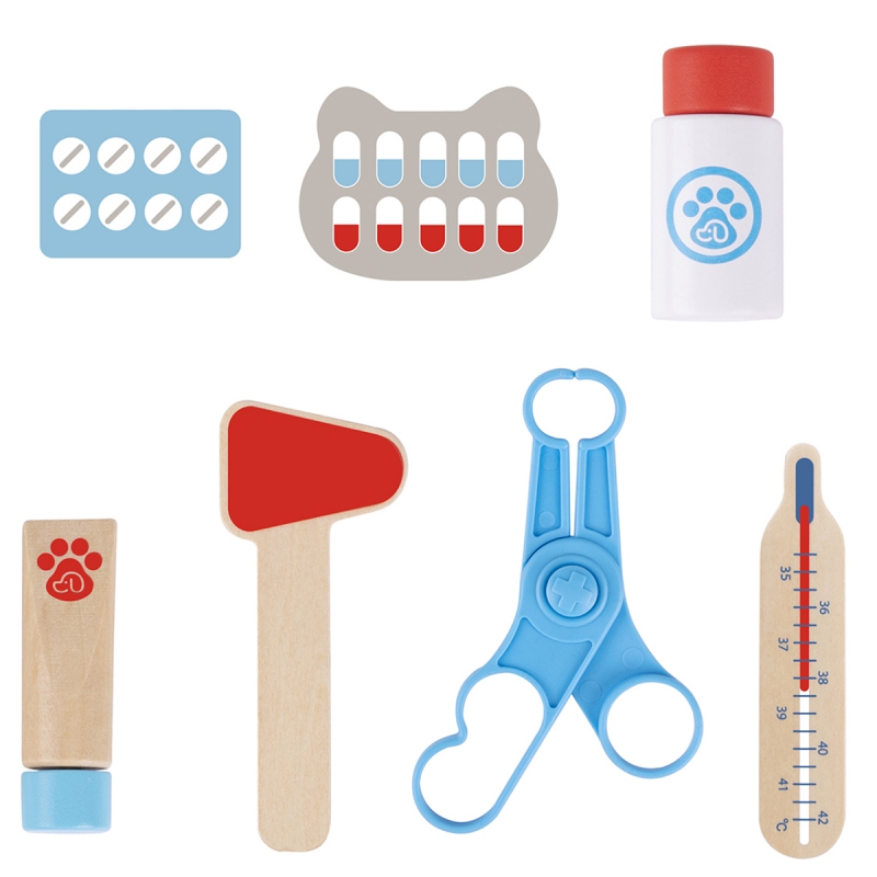 Szybki podglądW drewnianej walizce maluch znajdzie wszystkie akcesoria, które są niezbędne do pracy każdego prawdziwego doktora: stetoskop, strzykawkę, termometr, młoteczek, pastylki, maść, syrop…