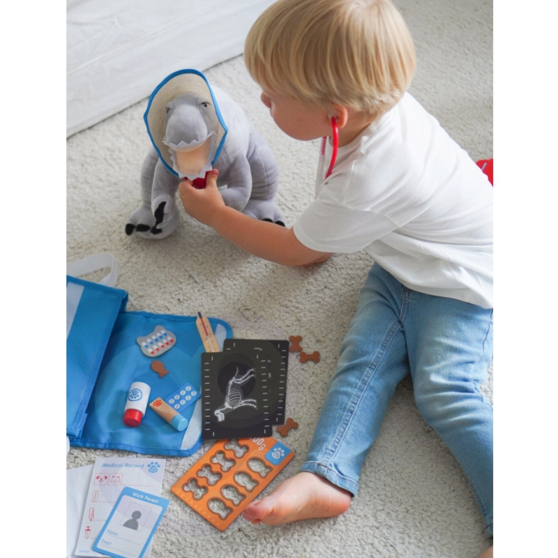 Tooky Toy zestaw weterynarza to świetna zabawka umożliwiająca wcielenie się w rolę prawdziwego weterynarza. Zabawa w lekarza uczy empatii oraz wrażliwości na odczucia innych. Opiekując się drugą istotą, często słabszą i mniejszą dziecko uczy się również odpowiedzialności. Jego bogate, wieloczęściowe wyposażenie i estetycznie wykonane przyrządy medyczne pobudzą wyobraźnie dziecka i w prosty sposób wytłumaczą dziecku, że weterynarze ratują życie zwierząt. Podaruj swojemu małemu miłośnikowi zwierząt wszystko czego potrzebuje, żeby zadbać o małego futrzanego przyjaciela.