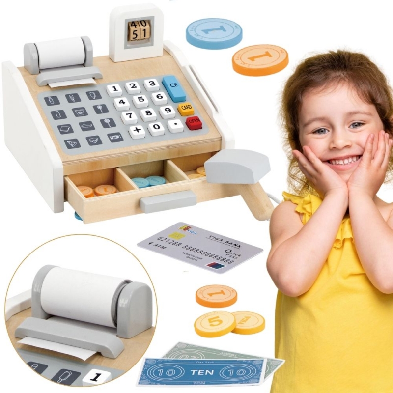 Kasa sklepowa to świetna drewniana zabawka, która pozwoli na odegranie wielu scenek, jakie mogą mieć miejsce w sklepie. Dzieci mogą wcielić się w role kasjera lub klienta oraz wspólnie ćwiczyć interakcje społeczne, oraz swoje zdolności komunikacyjne. Gotówka czy karta? Policz sumę należności, przyjmij pieniądze i wydaj poprawnie resztę. Kasa zawiera banknoty, monety, oraz kartę płatniczą. Dziecko może uczyć się bawiąc! Królowa Nauk - matematyka nie będzie już straszna.