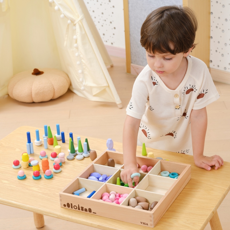 Klocki Nature Treasures VIGA to 141 luźnych elementów inspirowanych naturą – grzyby, plastry miodu, kamienie i stożki. Dzięki otwartej formie klocki nie narzucają zasad – dziecko może swobodnie sortować, budować i tworzyć własne historie. Zestaw wspiera rozwój manualny, koncentrację i wyobraźnię, będąc idealnym narzędziem do zabawy sensorycznej i artystycznej. To coś więcej niż zabawka – to inwestycja w rozwój Twojej pociechy!