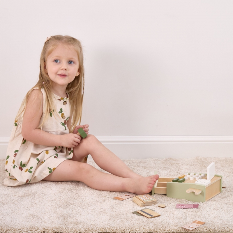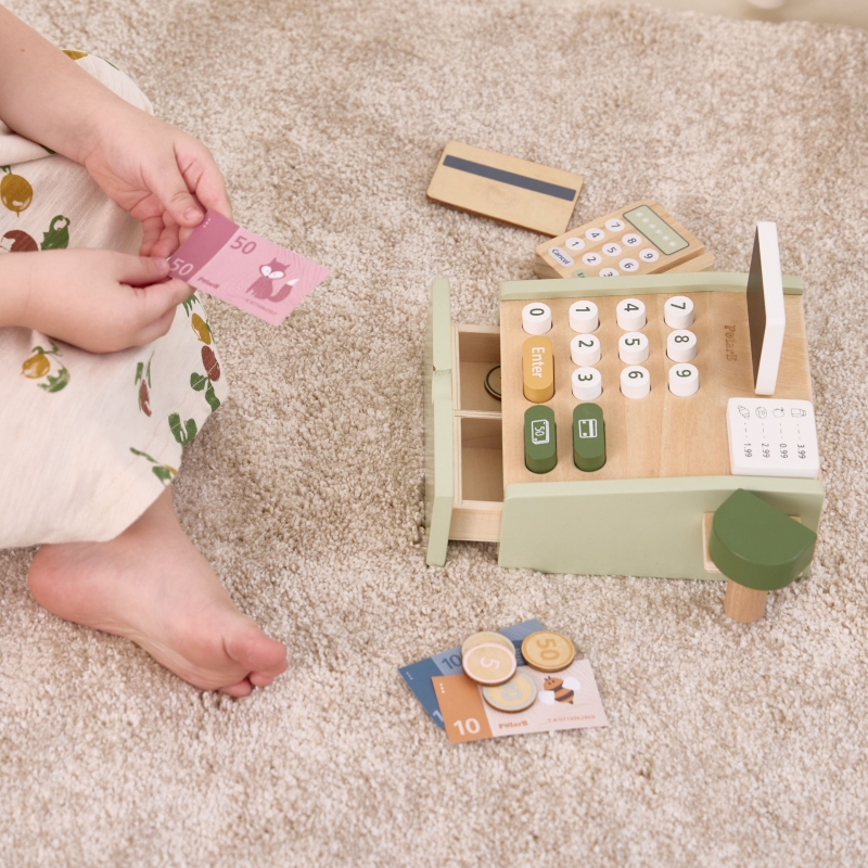 Kasa sklepowa to świetna drewniana zabawka, która pozwoli na odegranie wielu scenek, jakie mogą mieć miejsce w sklepie. Dzieci mogą wcielić się w role kasjera, lub klienta, oraz wspólnie ćwiczyć interakcje społeczne, oraz swoje zdolności komunikacyjne. Gotówka, czy karta? Policz sumę należności, przyjmij pieniądze i wydaj poprawnie resztę. Kasa zawiera banknoty, monety, oraz kartę płatniczą. Dziecko może uczyć się bawiąc! Królowa Nauk - matematyka nie będzie już straszna.