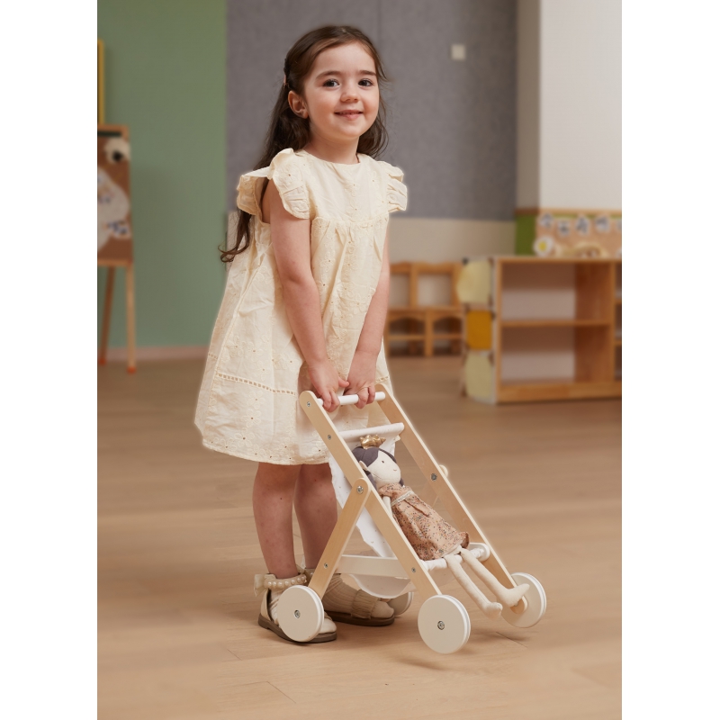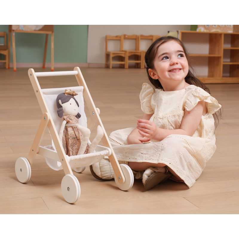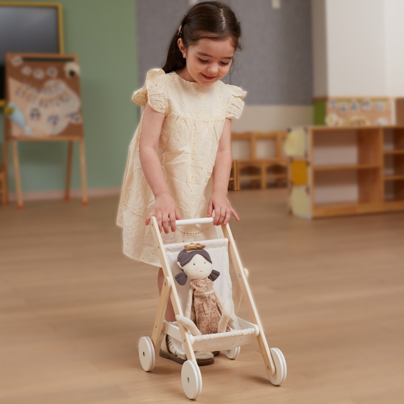 Drewniany wózek spacerowy od marki VIGA z serii PolarB to piękna zabawka, która przenosi dziecko w świat opieki nad lalką i radosnej zabawy. Stelaż wykonany jest z solidnego drewna bukowego, a materiał gondolki ozdobiono uroczym nadrukiem gwiazd i księżyca. Duże koła z dodatkiem gumy zapewniają stabilne i ciche prowadzenie, dzięki czemu maluch może „spacerować” po różnorodnych powierzchniach. Pod siedziskiem wózka znajduje się praktyczny koszyk, idealny na drobne akcesoria lalek, co zwiększa funkcjonalność zabawki. To nie tylko zabawa — wózek wspiera rozwój empatii, wyobraźni i zdolności motorycznych Twojego dziecka.