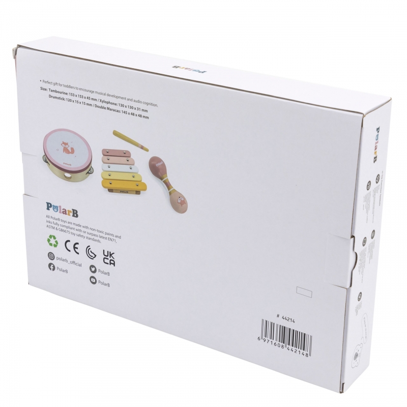 | Wymiary produktu | Tamburyn: 15,3 x 15,3 x 4,5 (cm); Ksylofon: 13 x 13 x 3,1 (cm); Marakas: 14,5 x 4,8 x 4,8 (cm) |