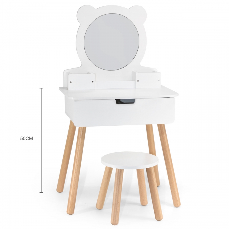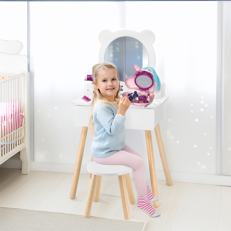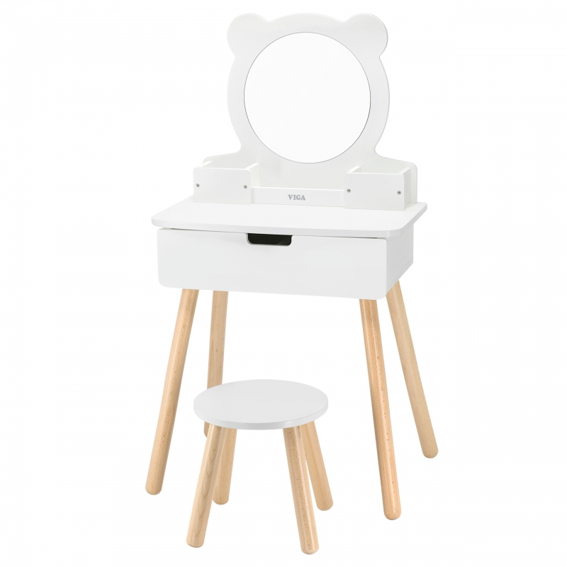 Duża, wolnostojąca biała toaletka + zestaw akcesoriów w pięknej torbie jednorożca od marki Viga to wymarzony komplet w pokoju każdej dziewczynki. Toaletka posiada wysuwaną szufladę, w której mała księżniczka może schować swoje skarby. Pod samym lustrem znajdują się przegródki na poręczne akcesoria. W zestawie znajdziemy również krzesełko do toaletki. W torebce jednorożca, znajdują się wszystkie niezbędne akcesoria jak z salonu piękności.