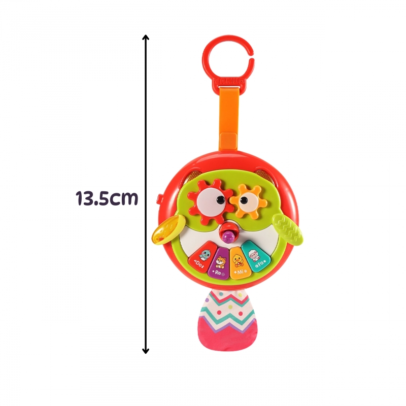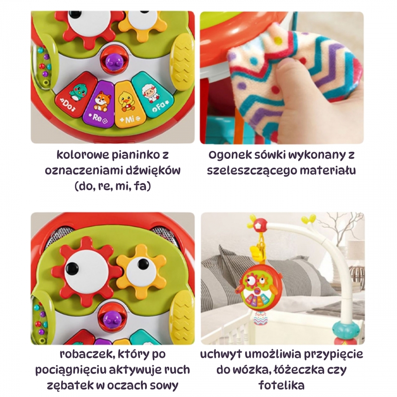Interaktywna zawieszka w kształcie sowy od marki WOOPIE to urocza i funkcjonalna zabawka dla najmłodszych, która łączy w sobie edukację i zabawę. Kolorowa sówka została zaprojektowana tak, aby przyciągać uwagę dziecka różnorodnymi bodźcami – wzrokowymi, dotykowymi i dźwiękowymi. Skrzydełka sowy są ruchome, dzięki czemu maluch może je poruszać podczas zabawy. Z dzioba wystaje robaczek, który po pociągnięciu aktywuje ruch zębatek w oczach sowy. Na brzuszku sowy znajduje się kolorowe pianinko z oznaczeniami dźwięków (do, re, mi, fa). Po naciśnięciu klawiszy dziecko usłyszy delikatne, przyjazne melodie, które wspomagają rozwój słuchu i uczą rozróżniania tonów. Ogonek sówki wykonano z szeleszczącego materiału, a zawieszka jest wyposażona w uchwyt, który umożliwia jej przypięcie do wózka, łóżeczka czy fotelika.