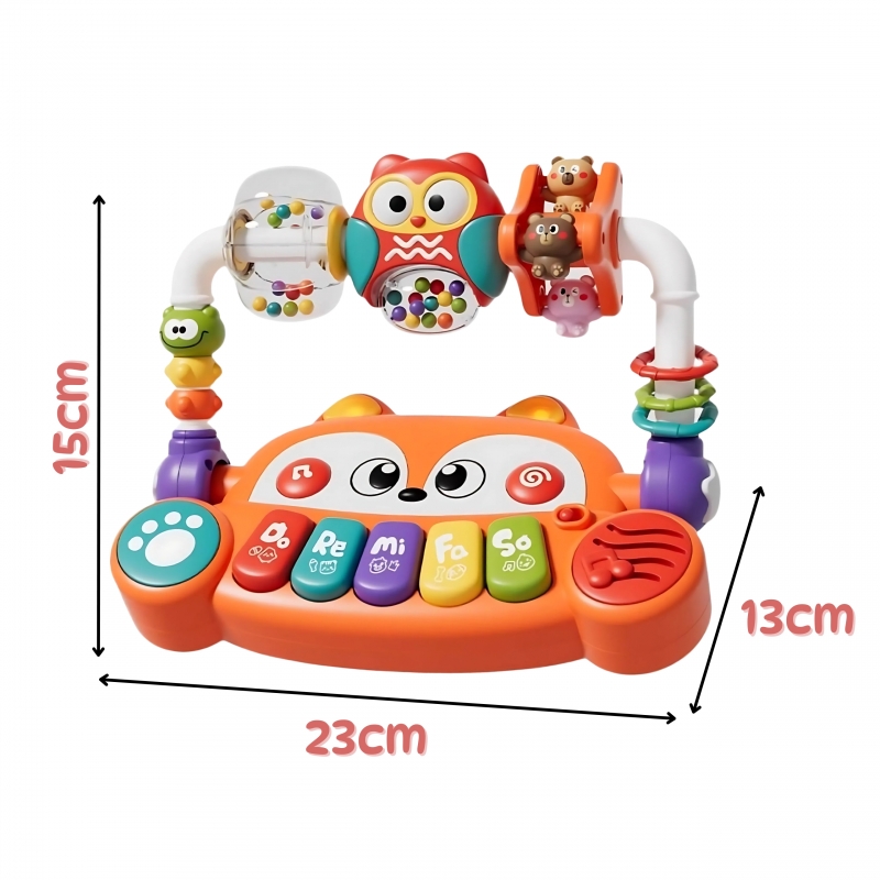 Szukasz zabawki, która nie tylko zajmie malucha na dłużej, ale również będzie wspierać jego rozwój już od pierwszych miesięcy życia? Interaktywne pianinko edukacyjne od marki Woopie łączy w sobie muzykę, światło, kolor i ruch stając się idealnym kompanem do codziennej zabawy, nauki i eksplorowania świata! Wyróżnia je przemyślana konstrukcja — zabawka została zaprojektowana w formie wesołego liska z dużymi oczami i uroczym pyszczkiem, które przyciąga uwagę dziecka. Kolorowe klawisze z nutkami wspierają wczesną edukację muzyczną, a efekty świetlne LED zsynchronizowane z dźwiękiem sprawiają, że zabawa staje się prawdziwym koncertem zmysłów!Dodatkowe elementy takie jak obracająca się sowa z grzechotkami, obracane figurki zwierzątek i kolorowe pierścienie zapewniają różnorodność bodźców i inspirują do aktywności fizycznej. Zabawka umożliwia samodzielne przełączanie trybów, co daje dziecku poczucie kontroli i motywuje do dalszego odkrywania. To idealny wybór na prezent dla niemowlaka, który wspiera rozwój sensoryczny, muzyczny i poznawczy w bezpieczny i przyjazny sposób. Zabawka została wykonana z nietoksycznych, wytrzymałych materiałów, a wszystkie krawędzie są zaokrąglone i gładkie — idealne do małych rączek. Niech Twój maluch już od najmłodszych lat odkrywa świat dźwięków, rytmu i koloru — wszystko to w jednej, magicznej zabawce edukacyjnej!