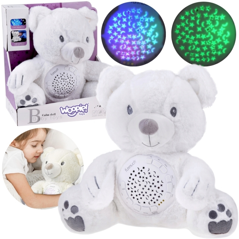 Mięciutki Miś Polarny z Projektorem od marki Woopie to idealny towarzysz snu dla każdego maluszka. Ta urocza przytulanka, wykonana z bezpiecznej, bawełnianej tkaniny, łączy w sobie funkcje projektora świetlnego i uspokajacza z muzyką. Miś pomaga ukoić dziecko do snu, emitując na suficie gwieździste niebo z księżycami w 7 różnych efektach świetlnych. Moduł dźwiękowy oferuje bogatą gamę uspokajających dźwięków: 10 delikatnych kołysanek oraz 5 rodzajów białego szumu. Moduł ma wbudowany timer z trzema opcjami czasu (30, 60 lub 90 minut), a także funkcję pętli (Loop) do ciągłego odtwarzania. Dodatkową zaletą jest możliwość prania misia w pralce (po wyjęciu modułu elektronicznego).