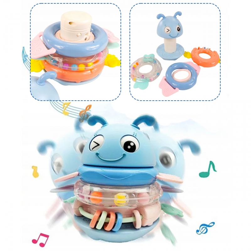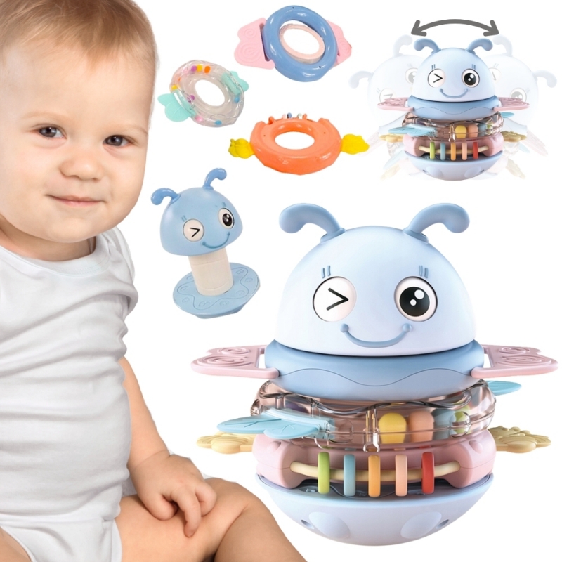 Niebieska Pszczółka Wańka Wstańka 2w1 marki Woopie to wielozadaniowa zabawka sensoryczna, która zachwyca zarówno swoją funkcjonalnością, jak i wyglądem! Dzięki połączeniu grzechotek i gryzaków z efektami dźwiękowymi zapewnia maluchowi wszechstronną zabawę i jednocześnie wspiera jego rozwój już od pierwszych miesięcy życia. Trzy kolorowe obręcze, które pełnią funkcję zarówno grzechotek, jak i gryzaków, można nakładać na specjalny palik, który w zależności od wybranego trybu będzie odtwarzał piosenkę albo wydawał zabawny dźwięk. Główka uroczej pszczółki z ruchomymi oczkami wieńczy całość, tworząc atrakcyjną formę, która przyciąga wzrok dziecka. Zabawka została zaprojektowana z myślą o najmłodszych dzieciach. Delikatne silikonowe wypustki na obręczach idealnie sprawdzają się jako gryzaki podczas ząbkowania, a bezpieczne, zaokrąglone kształty umożliwiają swobodne chwytanie i manipulowanie. Wszystkie elementy są kolorowe, różnorodne w fakturze i odpowiednio duże, co stymuluje zmysły, ciekawość i motorykę dziecka. Dzięki zaokrąglonej podstawie zabawa pod wpływem ruchu delikatnie się kołysze, a jej wywrócenie wcale nie jest takie łatwe! To nie tylko zabawka, ale towarzysz codziennej nauki i rozwoju.