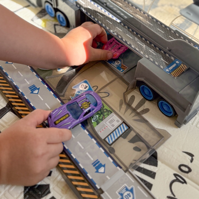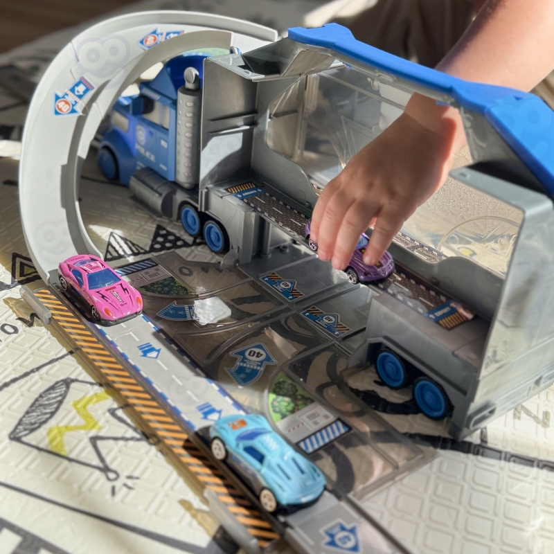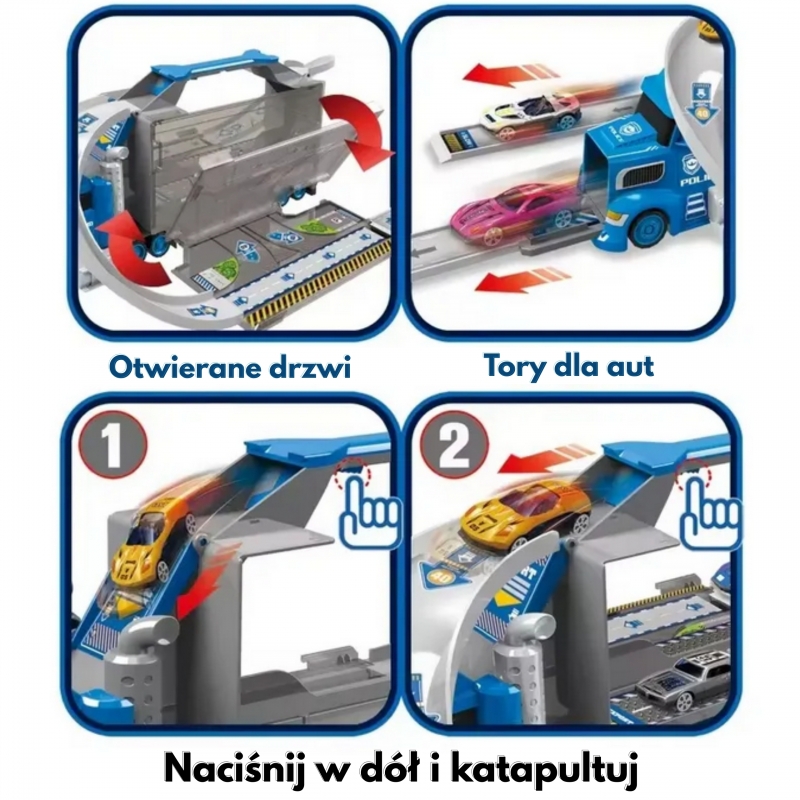 Zestaw ciężarówka policyjna to wielofunkcyjna zabawka od marki Woopie, która w jednej chwili może pełnić rolę klasycznej ciężarówki transportowej, a po rozłożeniu zamienia się w rozbudowany tor wyścigowy z wyrzutnią. Główna część zestawu to duża, efektowna ciężarówka stylizowana na pojazd policyjny, która pełni funkcję zarówno pojazdu transportowego, jak i przenośnej walizki na samochodziki i akcesoria. Po otwarciu naczepy i rozłożeniu elementów, użytkownik zyskuje dostęp do garażu oraz toru wyścigowego, na którym można organizować emocjonujące wyścigi i pojedynki samochodowe.