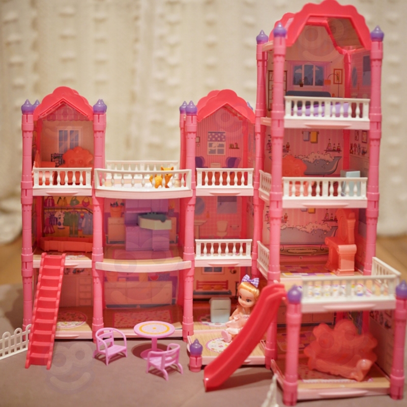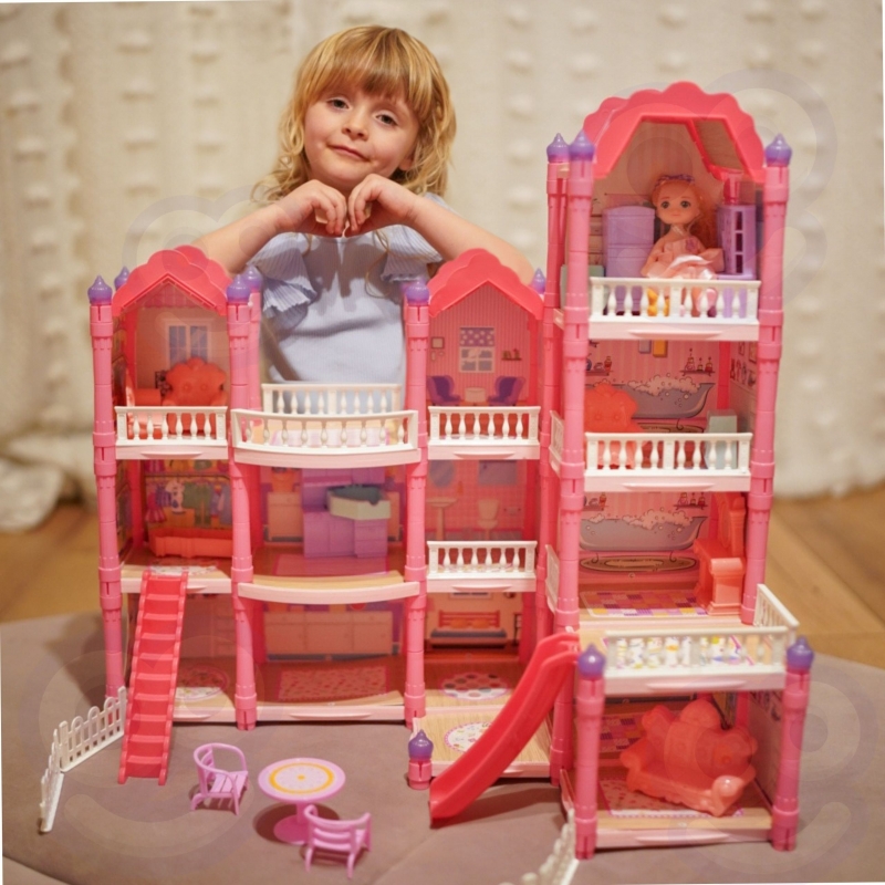 Poznaj wspaniały, trzypiętrowy domek dla lalek z różowym dachem, który stanie się ulubionym miejscem zabawy Twojego dziecka! Ta piękna willa o imponujących wymiarach została zaprojektowana z dbałością o każdy szczegół, co sprawia, że wygląda jak prawdziwy dom. Zestaw zawiera aż 296 elementów do złożenia, w tym bogate wyposażenie wnętrza i urocze mebelki, które pozwolą małej projektantce na samodzielne zaaranżowanie każdego z pomieszczeń. Domek posiada oświetlenie nocne, które dodaje mu magicznego charakteru. To idealna zabawka, która rozwija kreatywność, wyobraźnię oraz umiejętności manualne. W zestawie znajduje się wszystko, co potrzebne, aby stworzyć wymarzony dom dla lalek: od mebelków, przez akcesoria, aż po uroczą lalkę-mieszkankę. Zabawa w dom nigdy nie była tak realistyczna i wciągająca! Zjeżdżalnia, schody i taras to dodatkowe elementy, które urozmaicą zabawę i pozwolą na odgrywanie wielu scenariuszy. Dzięki solidnej konstrukcji domek zapewnia długie godziny fantastycznej i bezpiecznej zabawy.