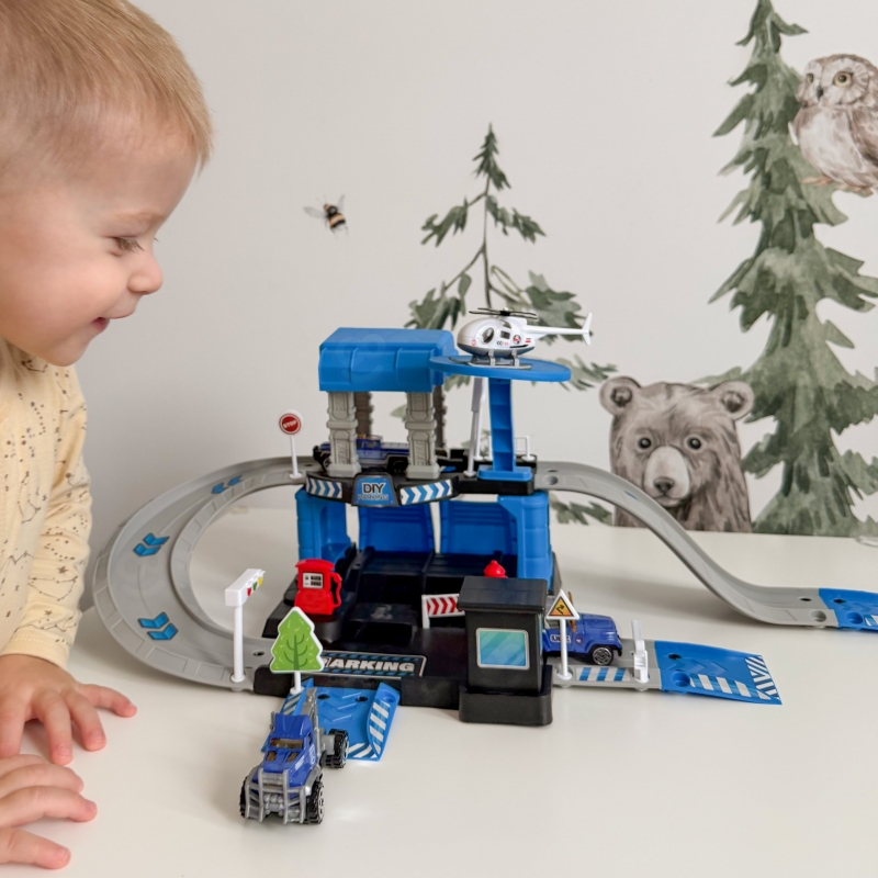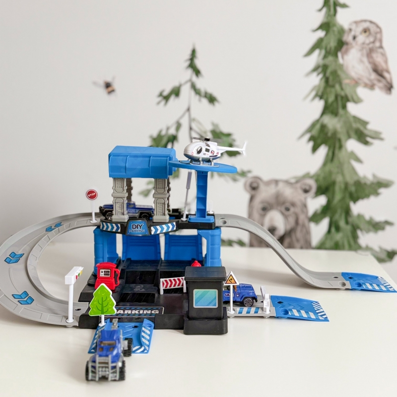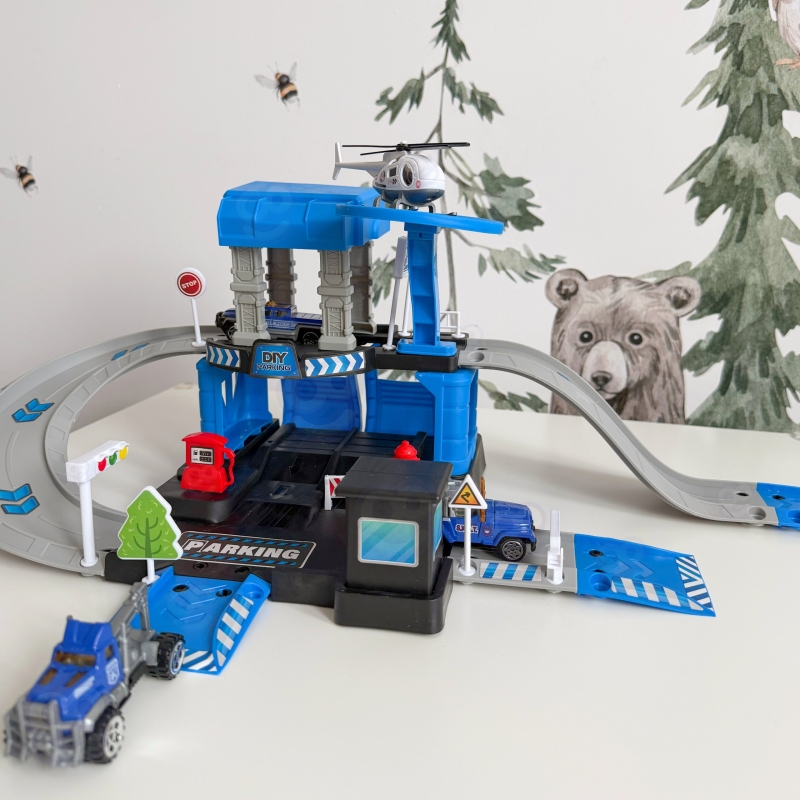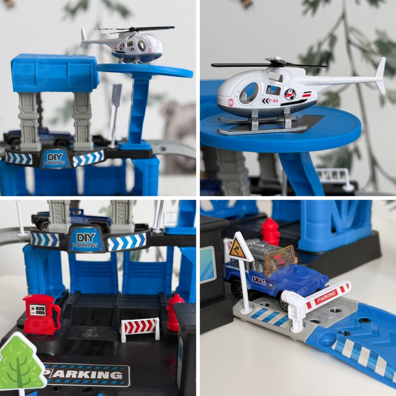 Parking policyjny od marki Woopie z akcesoriami i pojazdami to fantastyczny zestaw tematyczny dla każdego małego miłośnika motoryzacji i służb mundurowych! Zabawka zachwyca bogactwem detali, ilością elementów, żywą kolorystyką i wieloma możliwościami zabawy. Dwupoziomowy parking z rampami, lądowiskiem dla helikoptera i licznymi akcesoriami pozwala dziecku na tworzenie własnych scenariuszy zabawy, ograniczonymi tylko wyobraźnią. Trzy metalowe samochodziki i helikopter pozwolą wykorzystać każdą z funkcji garażu i pozwolą na zabawę w gronie rodzeństwa lub przyjaciół oraz wcielenie się w postać małego policjanta.