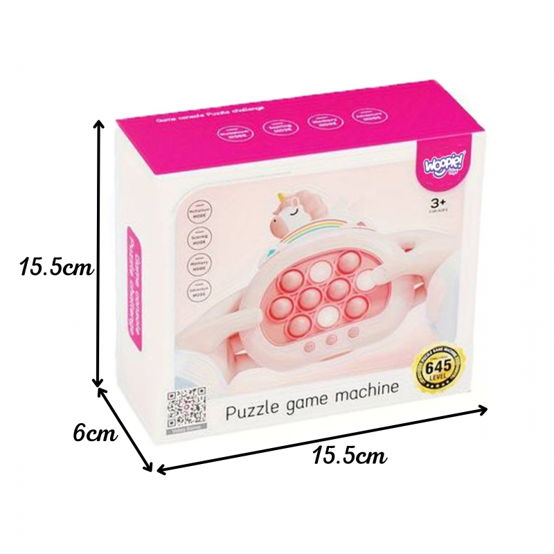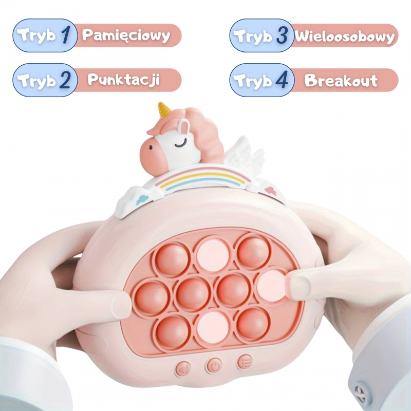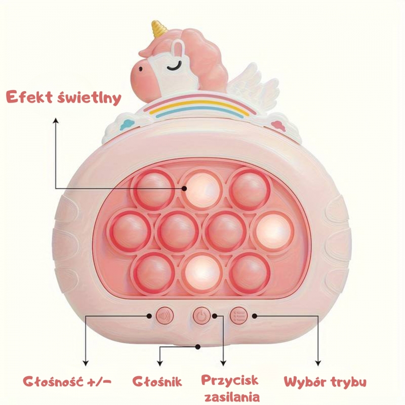 Gra POP IT Jednorożec marki WOOPIE łączy w sobie zabawkę antystresową z grą zręcznościową i edukacyjną . Gra posiada efekty świetlne i wydaje radosne dźwięki, które zachęcają dzieci do dłuższej zabawy i urozmaicają rozgrywkę. Zabawka jest niewielka więc, sprawia, że możemy zabrać ją ze sobą. To idealna propozycja zarówno dla dzieci, które potrzebują bodźców sensorycznych, jak i dla tych, które uwielbiają gry, rywalizację i szybką rozgrywkę. Świetna do rozwijania refleksu, koncentracji i cierpliwości!. Rozwija umysł, zdolności manualne, koordynację wzrokowo-ruchową oraz trenuje spostrzegawczość i pomaga w walce ze stresem.