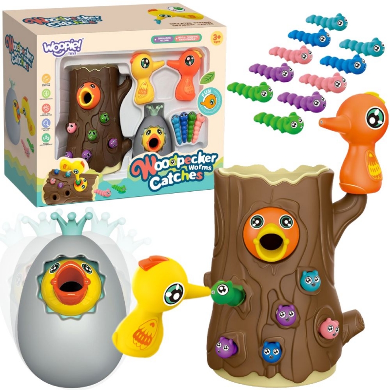 Gra polega na nakarmieniu głodnego pisklaka robaczkami ukrytymi w pniu drzewa. Dziecko używa magnetycznych dziobów dzięciołów, aby "złapać" robaczki i przenieść je do pisklaka. Zabawa wymaga precyzji i skupienia, dzięki czemu dzieci mogą ćwiczyć sprawność manualną, a przy okazji świetnie się bawić. Po zakończeniu rozgrywki robaczki można wysypać z pnia i przygotować wszystko do kolejnej rundy