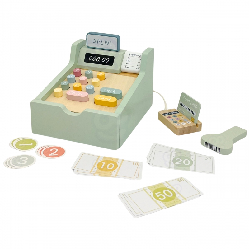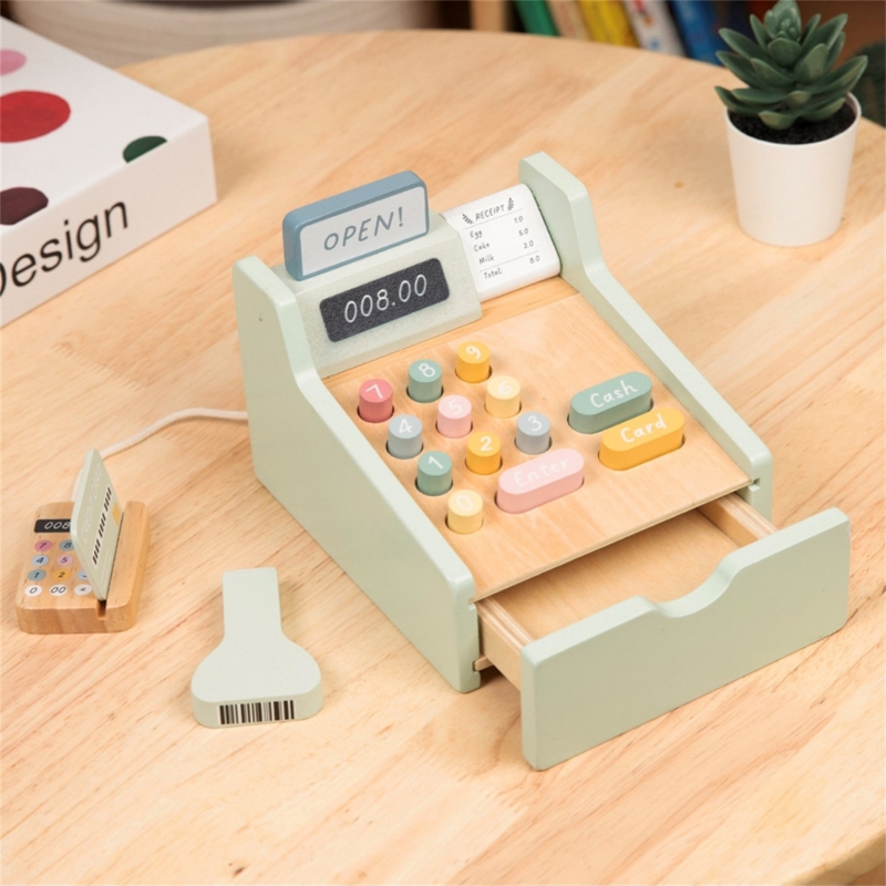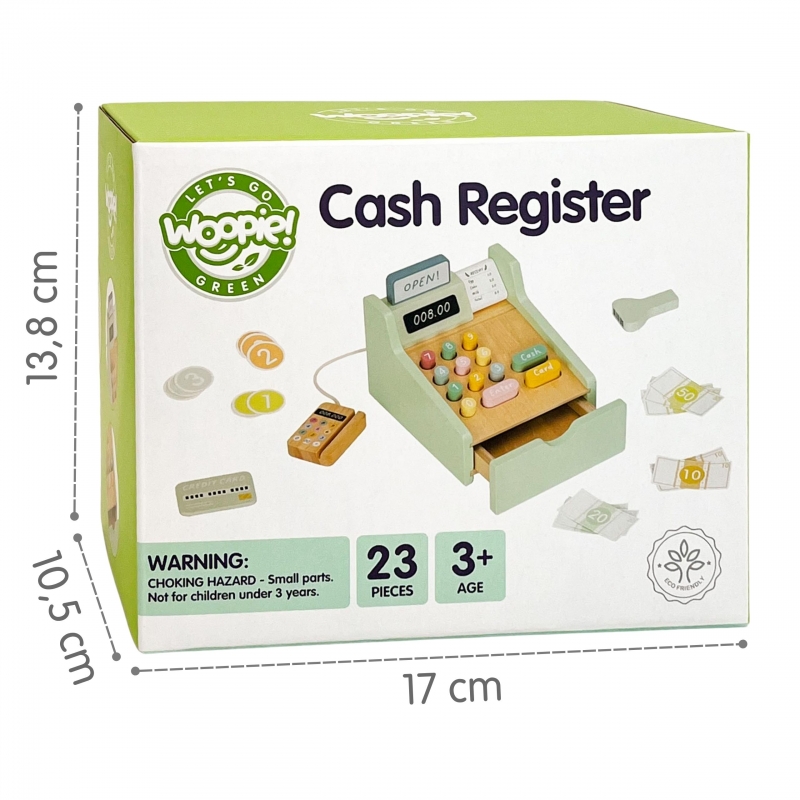 Pozwól swojemu dziecku zostać prawdziwym sklepikarzem dzięki tej uroczej drewnianej kasie fiskalnej marki Woopie Green! To nie tylko pięknie wykonana zabawka w pastelowych kolorach, ale przede wszystkim brama do niezliczonych godzin kreatywnej zabawy. Zestaw wyposażony jest w wszystko, czego potrzeba do prowadzenia własnego sklepiku – od skanera kodów terminal płatniczy, kolorowych banknotów po monety i karty kredytowe. Każdy element został przemyślany tak, aby zabawa była realistyczna i rozwijająca, a dziecko mogło poczuć się jak dorosły podczas codziennych zakupów.