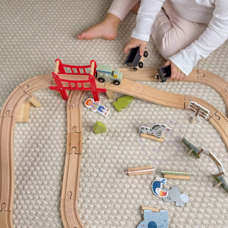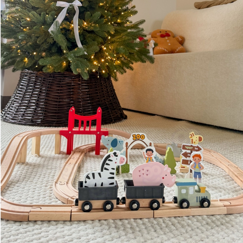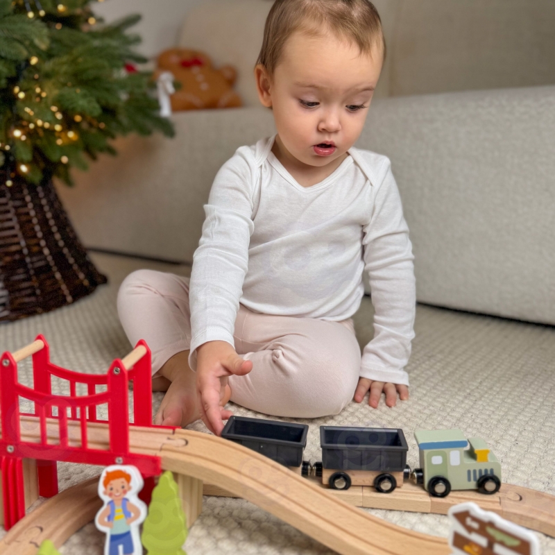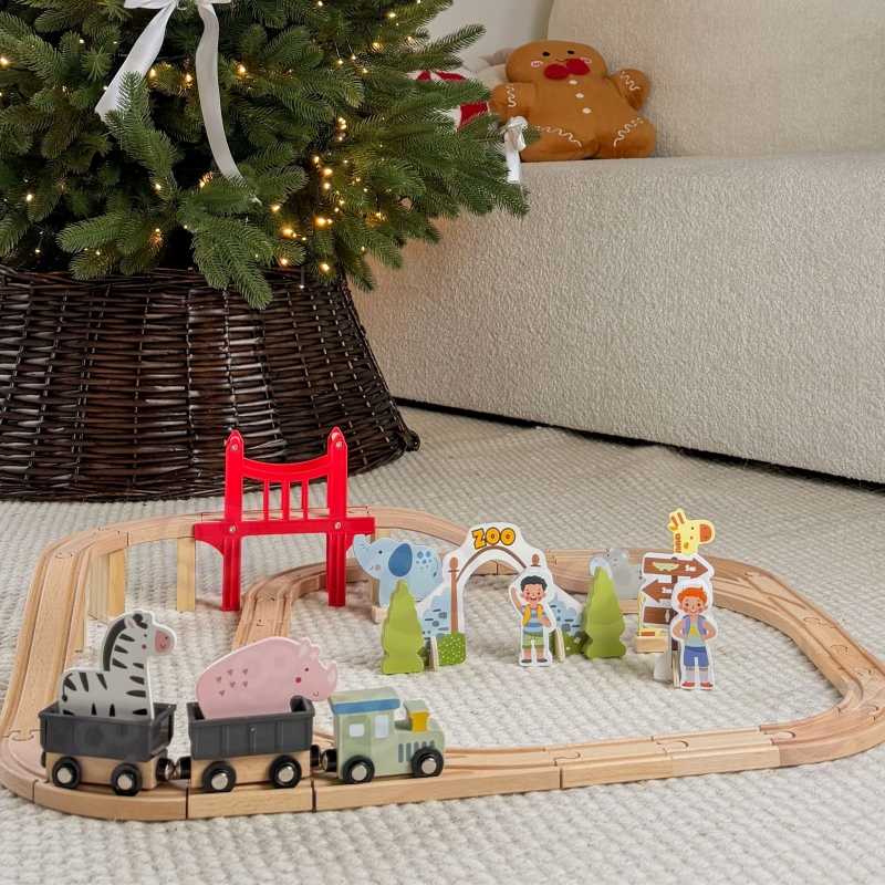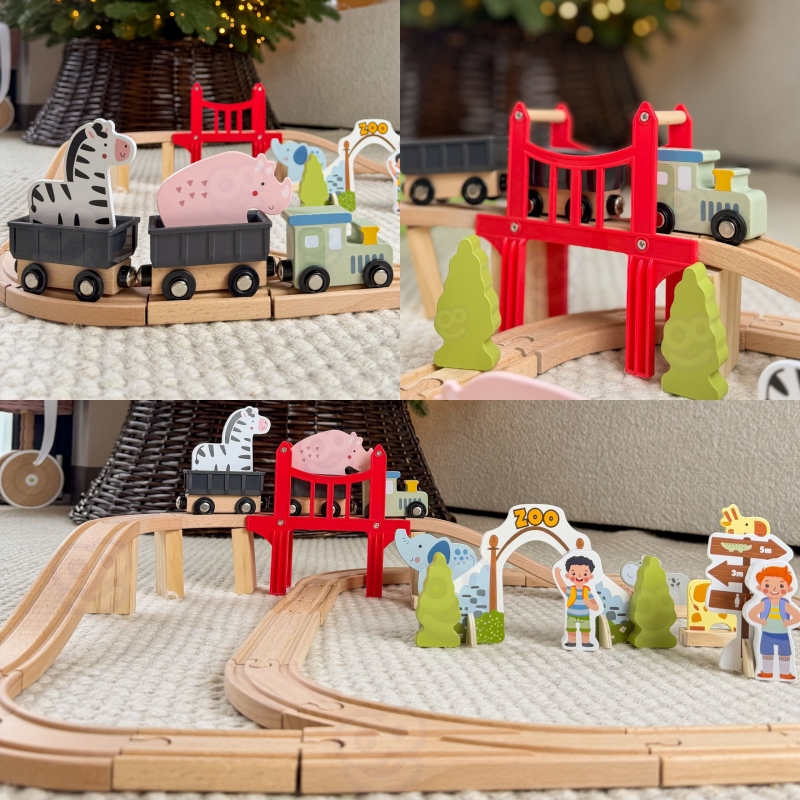 Zapraszamy w fascynującą podróż przez zoo pełne uroczych mieszkańców! Ten drewniany zestaw kolejowy marki Woopie Green to znacznie więcej niż zwykła zabawka – to przepustka do świata wyobraźni, gdzie każda przejażdżka pociągiem staje się niepowtarzalną przygodą. Solidnie wykonane tory łączą się w różnorodne konfiguracje, a czerwona brama do zoo oraz most wznoszą zabawę na wyższy poziom. Pociąg z wagonami połączonymi magnesami przemierza drewniany tor, odwiedzając żyrafę, słonia, lwa, zebry i inne zwierzęta. Dziecko samodzielnie buduje tor, aranżuje scenerie i tworzy własne historie – to czysta radość z twórczej zabawy, która angażuje na długie godziny.