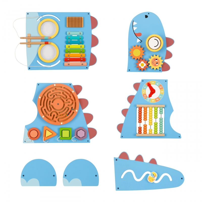 Odkryj magiczny świat dinozaurów połączony z edukacyjną przygodą! Ta wyjątkowa drewniana tablica aktywności w kształcie uroczego dinozaura to prawdziwe centrum rozrywki dla małych odkrywców. Sześć różnorodnych paneli oferuje bogactwo zajęć, które na długie godziny pochłoną uwagę dziecka, rozwijając jednocześnie kluczowe umiejętności. Każdy element został przemyślanie zaprojektowany, aby stymulować ciekawość poznawczą i zapewniać radość z samodzielnego odkrywania.