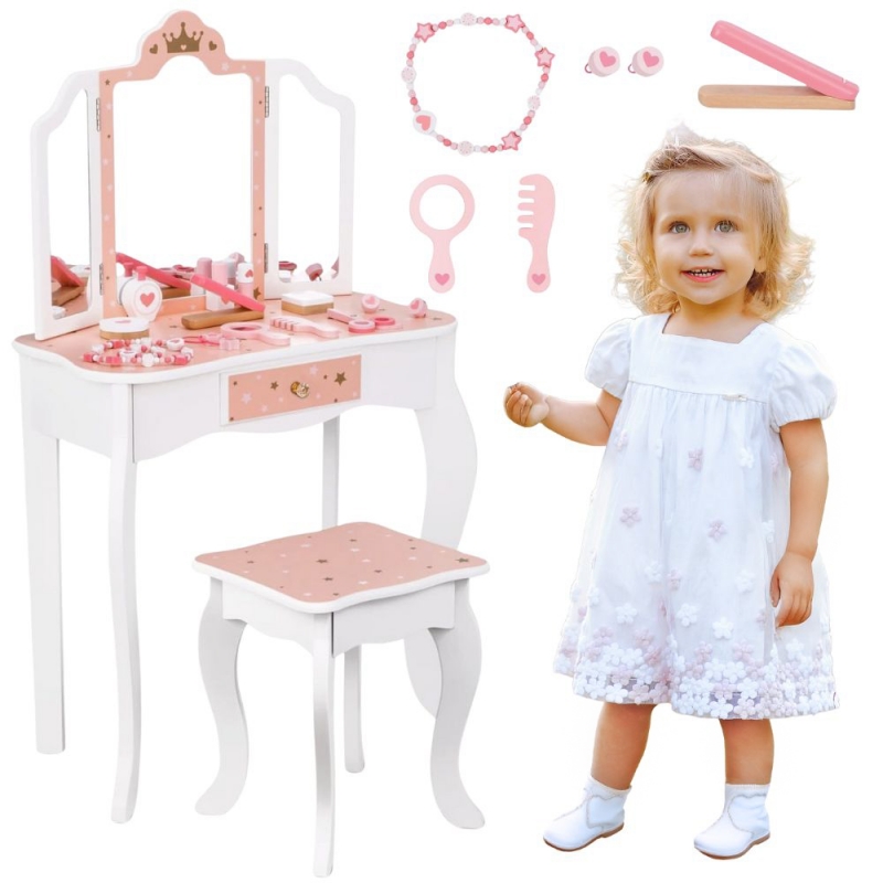 Drewniana toaletka z akcesoriami dla dzieci od Woopie Green to niezwykle urocza i dopracowana w każdym szczególe zabawka, która przenosi dzieci w świat wyobraźni, piękna i kreatywnej zabawy. Zaprojektowana z myślą o najmłodszych miłośniczkach stylu i estetyki, stanowi nie tylko piękny mebel do pokoju, ale również narzędzie wspierające rozwój emocjonalny, społeczny i manualny dziecka. Toaletka zachwyca eleganckim designem inspirowanym klasycznymi meblami dorosłych – ma kształt delikatnego biureczka z potrójnym lustrem, szufladką na drobiazgi i wygodnym stołeczkiem dopasowanym do wzrostu dziecka. Całość wykonana jest z wysokiej jakości drewna,w odcieniach różu, bieli i złota.Trzyczęściowe lustro z ruchomymi skrzydłami umożliwia przeglądanie się z różnych stron, a szeroki blat zapewnia dużo miejsca na wszystkie niezbędne dodatki. W zestawie znajduje się również bogaty komplet akcesoriów, dzięki którym zabawa staje się jeszcze bardziej realistyczna.