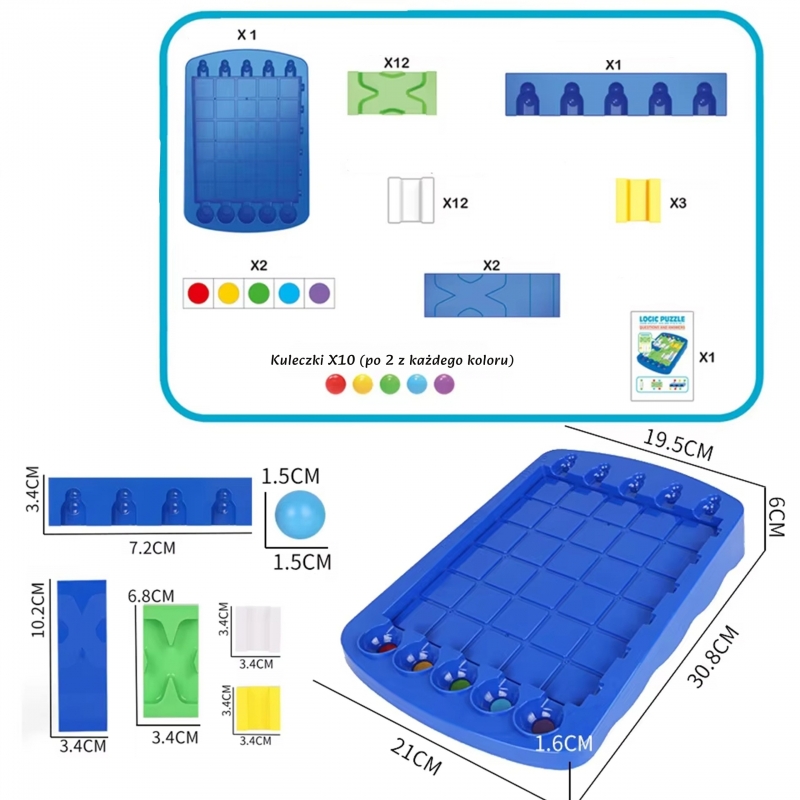 Gra Strategiczna od marki WOOPIE, to wspaniały pomysł na prezent dla twojego dziecka jeśli chcesz aby spędziło czas na rozwijającej, wspierającej rozwój grze. Proste zasady i rozgrywka, która angażuje mózg dziecka do myślenia, gwarantują godziny wspaniałej zabawy. Zasady są łatwe - każdy kolor kulki musi trafić do odpowiadającemu jej dołeczka. Nie jest to jednak takie łatwe, do gry dołączona jest książeczka z 60 zadaniami do wykonania podczas budowy różnych torów dla kuleczek.
