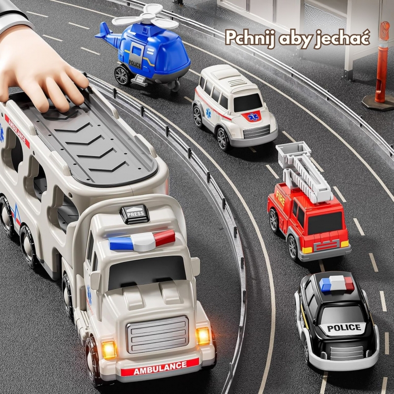 Duży Zestaw Ratunkowy Ciężarówka+4 Auta od Marki Woopie Zaprojektowana z myślą o małych pasjonatach straży pożarnej, policji,pogotowia ta zabawka 5 w 1 to idealny zestaw dla każdego małego ratownika! Naciśnij przycisk na górze kabiny ciężarówki, aby zobaczyć jasne migające światła i usłyszeć realistyczne syreny, bardzo atrakcyjne dla dzieci. Zestaw zawiera dużą ciężarówkę transportową oraz cztery pojazdy ratunkowe: samochód strażacki, radiowóz, helikopter policyjny, karete. Każdy z pojazdów ma ruchome elementy, które pozwolą Twojemu dziecku poczuć się jak prawdziwy bohater podczas akcji ratunkowych! Zestaw jest świetnym pomysłem na prezent urodzinowy, świąteczny czy na inne okazje.