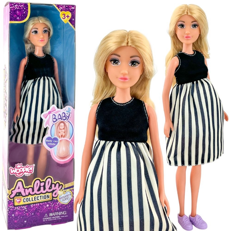Lalka w ciąży od marki Woopie to niezwykła propozycja dla dzieci, które uwielbiają zabawy w dom, rodzinę i odgrywanie ról. Ta starannie wykonana zabawka pozwala wcielać się w postać przyszłej mamy i przeżywać wspólnie z nią ważny etap życia — oczekiwanie na dziecko. Realistyczny brzuch lalki skrywa małe niemowlę, które można wyjąć, co dodaje autentyczności i angażuje dziecko w odgrywanie emocjonalnych scenek. Dzięki funkcji wyjmowania niemowlęcia, dziecko ma szansę obserwować i symulować proces narodzin oraz pierwszych chwil opieki nad maluszkiem. Lalka ubrana jest w elegancką sukienkę w czarno-białe paski, która podkreśla jej modny wygląd, a miękkie, długie włosy można czesać i stylizować. Zabawka nie tylko bawi, ale również uczy empatii i wzmacnia więzi społeczne poprzez naśladowanie codziennych sytuacji rodzinnych. Jest to idealny wybór dla dzieci, które lubią odgrywać role, tworzyć scenariusze i wyrażać emocje poprzez zabawę. Lalka może być również świetnym narzędziem wspierającym rozmowy o rodzinie, miłości i opiece, zarówno w domu, jak i w przedszkolu.