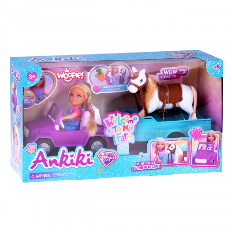 Wyrusz na wiejskie przygody z zestawem Kiki Lalka z Koniem, Samochodem i Przyczepą od marki Woopie! Ten obszerny zestaw do odgrywania ról z motywem ranczo/farmy zawiera mini lalkę, która potrafi usiąść za kierownicą fioletowego pojazdu terenowego. Doczep do niego turkusową przyczepę, aby przewieźć swojego konia! Lalka ma długie, blond włosy, które można czesać, a koń posiada siodło i uzdę. To idealna zabawka, która rozwija wyobraźnię i kreatywność oraz pozwala na tworzenie nieskończonej ilości scenariuszy związanych z życiem na farmie. Zestaw przeznaczony jest dla dzieci od 3 roku życia.