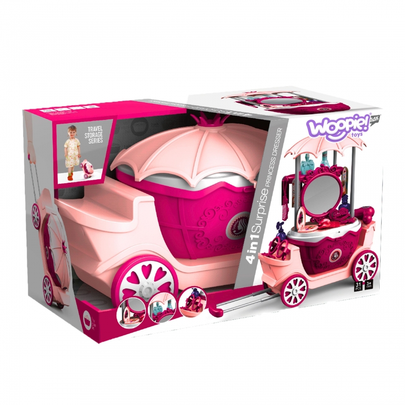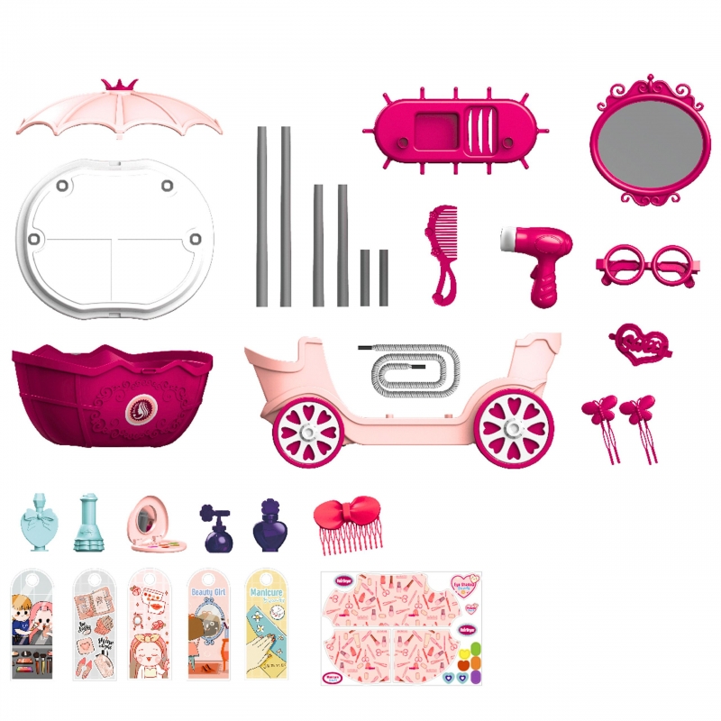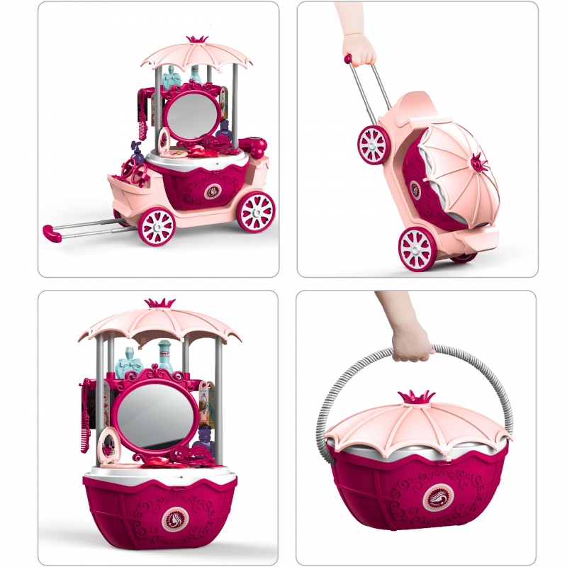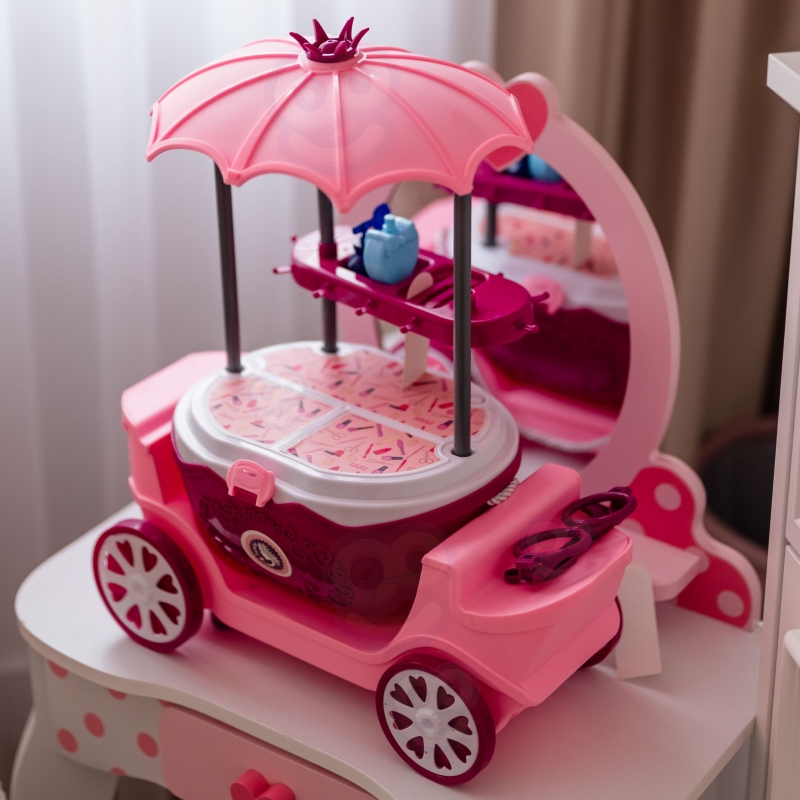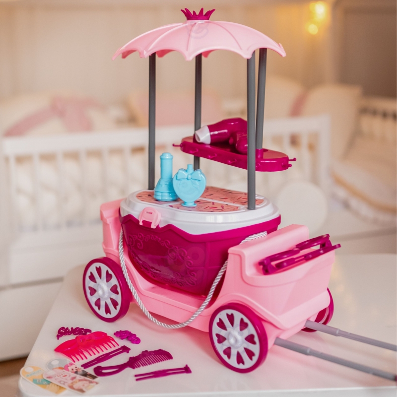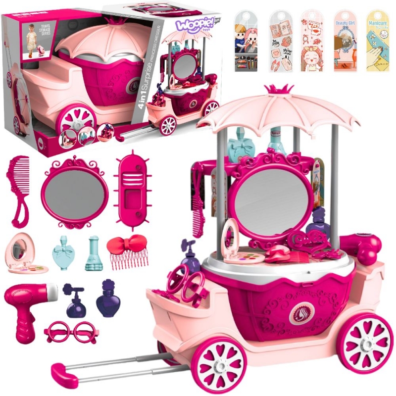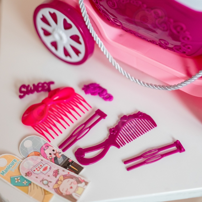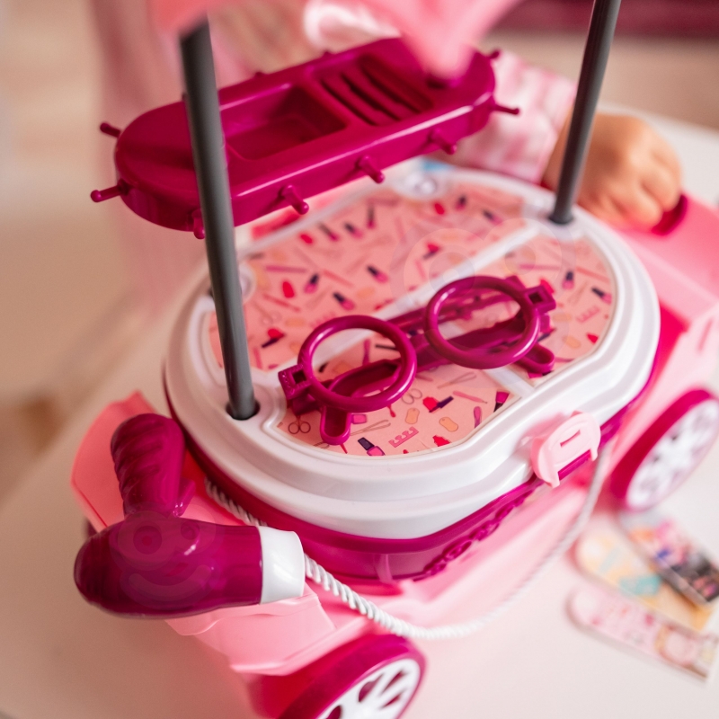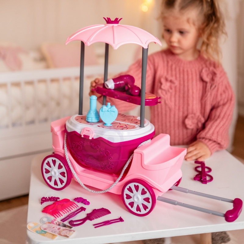 Kosmetyczny wózek na kółkach z lustrem i akcesoriami zachwyci każde dziecko swoim bajkowym wyglądem i bogatym wyposażeniem. To mobilny salon piękności w formie eleganckiej karety z daszkiem, dużym lustrem i zestawem kolorowych dodatków. Całość została zaprojektowana tak, aby zapewnić dzieciom godziny kreatywnej i angażującej zabawy, rozwijając przy tym wiele ważnych umiejętności. Zabawka łączy w sobie cztery różne funkcje: może być używana jako toaletka, elegancki wózek, praktyczna walizka na kółkach oraz poręczny koszyk. Dzięki temu dziecko może bawić się zarówno w domu, jak i zabrać zestaw w podróż lub do znajomych. Duże lustro w ozdobnej ramie pozwala na zabawę w stylizacje, a różnorodne akcesoria fryzjerskie i kosmetyczne sprawiają, że każda chwila staje się magiczną przygodą. Kosmetyczny wózek to nie tylko świetna forma zabawy, ale również sposób na rozwój dziecka. Dzięki wielofunkcyjnej konstrukcji i bogatym akcesoriom, zabawka dostarcza mnóstwo frajdy i staje się nieodłącznym elementem codziennych zabaw.