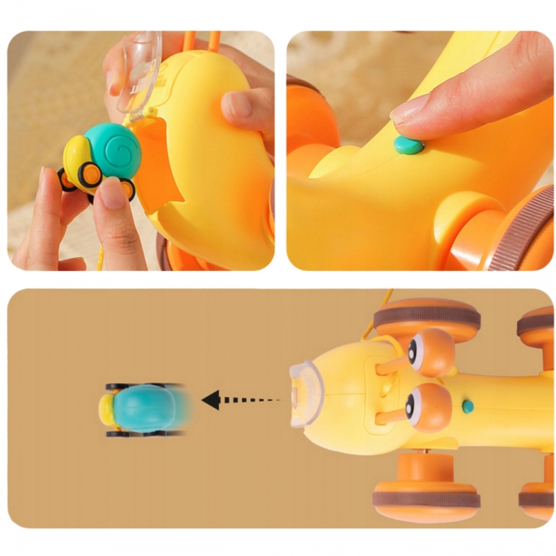 Wielofunkcyjna zabawka do pchania ślimaka od marki WOOPIE która przyciąga uwagę dzieci i stymuluje ich wyobraźnię. Jasne kolory poprawiają także ich percepcję wzrokową i zmysł estetyczny. Zabawka do ciągnięcia ślimaka zapewnia różne sposoby zabawy i nauki. Możesz uderzać w klawisze aby ćwiczyć słuch dzieci i koordynację wzrokowo-ruchową. Możesz także ciągnąć ślimaka na smyczy lub popchnąć go i pozwolić mu ślizgać się po podłodze, co zwiększa zabawę i wyzwanie.Podczas zabawy dzieci poznają zwierzęta, muzykę oraz związki przyczynowo-skutkowe. Zachęcaj do obserwacji, umiejętności logicznego myślenia i koordynacji fizycznej, podczas gdy dziecko będzie mogło cieszyć się godzinami kreatywnej zabawy. Zabawka do ciągnięcia ślimaka to świetny sposób na dzielenie się szczęśliwym czasem z dziećmi. Mamy mogą bawić się ze swoimi pociechami i patrzeć, jak chichoczą, gdy ślimak się porusza. Ta zabawka nadaje się do interakcji rodzinnych i może wzmacniać wzajemne uczucia. Zabawka składa się z dwóch części: muszli ślimaka- która zawiera cymbałki, oraz pałeczki do nich w kształcie oczu ( umieszczone są w środku muszli). Druga część to wyrzutnia małego autka z ciała ślimaka- na grzbiecie zabawki umieszczony jest przycisk, który otwiera wyrzutnię dla autka.