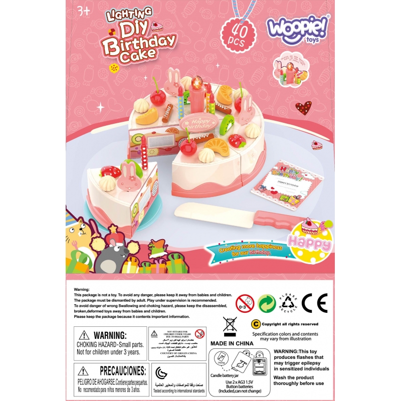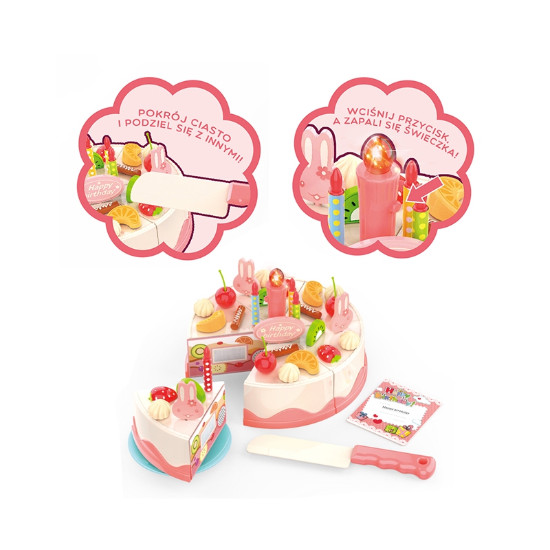Tort urodzinowy od renomowanej marki Woopie to idealna propozycja na spotkania z przyjaciółmi. Zestaw będzie idealnym atrybutem każdej małej gospodyni czy każdego małego gospodarza do zorganizowania niezapomnianego przyjęcia. W zestawie znajdziemy pięknie udekorowany tort, który możemy pokroić na 6 kawałków i poczęstować swoich gości. Dziecko może dekorować tort według własnych pomysłów dzięki dołączonym do zestawu świeczkom, ozdobom w kształcie króliczka i owocom. Na środku tortu znajduje się świeczka, która po naciśnięciu przycisku zapala się. Kawałki tortu można w prosty sposób łączyć ze sobą dzięki rzepom. Z takim zestawem zabawie nie będzie końca!