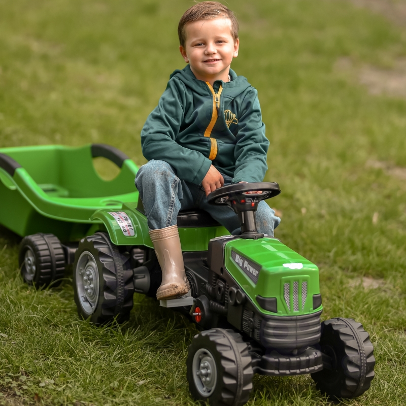 Traktor na pedały z przyczepą marki Woopie to doskonały wybór dla każdego malucha, który marzy o pracy na farmie lub po prostu uwielbia pojazdy rolnicze! Dzięki realistycznemu wyglądowi i ruchomej przyczepie, dziecko może wcielać się w rolę prawdziwego traktorzysty – transportując zabawki, piasek, kamienie czy inne „ładunki” w domu, w ogrodzie, na działce lub placu zabaw. Traktor napędzany siłą nóg dziecka pozwala aktywnie korzystać z zabawki, co zwiększa wytrzymałość dziecka i zachęca do ruchu na świeżym powietrzu. To doskonały prezent dla każdego dziecka powyżej 3. roku życia. Niezależnie od tego, czy ktoś mieszka na wsi czy w mieście.