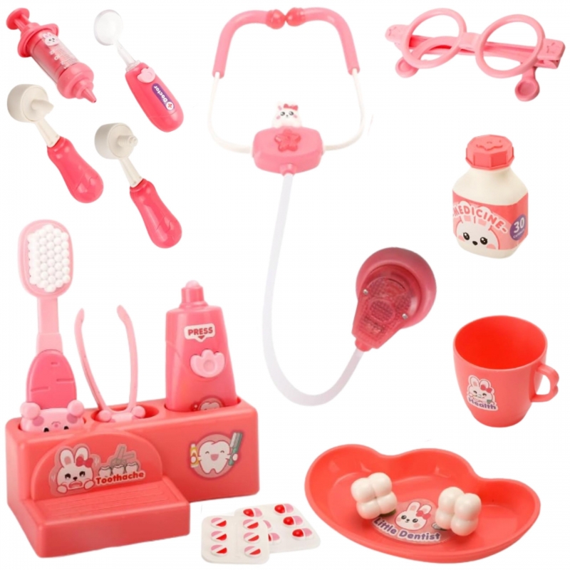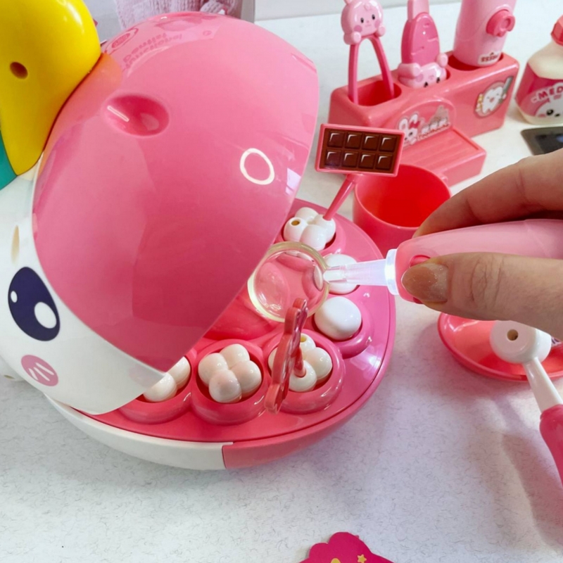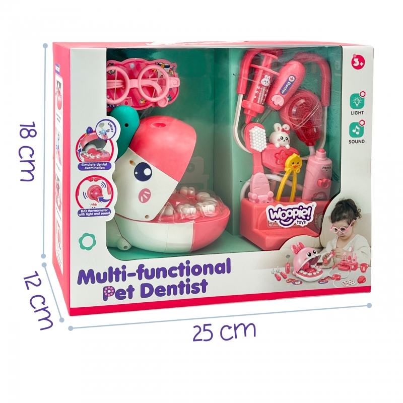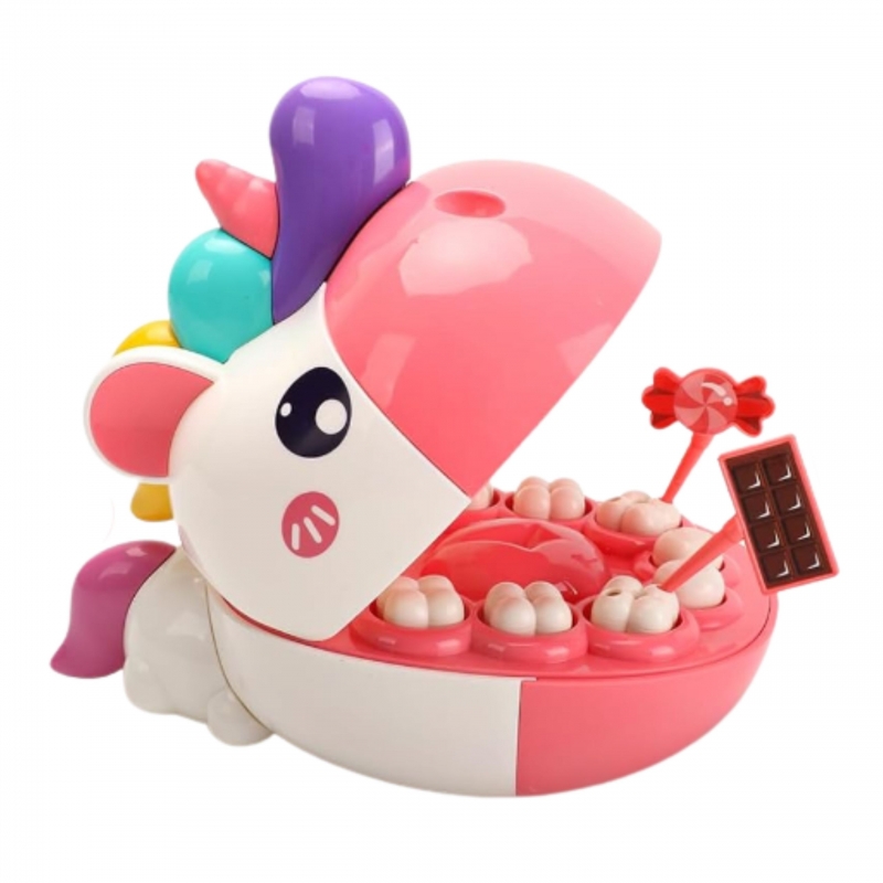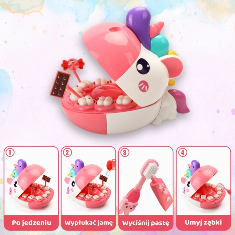 Zestaw małego dentysty głowa jednorożca to wyjątkowa zabawka edukacyjna, która wprowadza dzieci w świat medycyny i dbania o zdrowie jamy ustnej w sposób pełen radości i fantazji Dzięki temu zestawowi maluch może wcielić się w rolę małego dentysty, przeprowadzać badania, leczyć ząbki pacjenta i uczyć się podstaw higieny w zabawny oraz bezpieczny sposób. Realistyczny kształt zębów i przyjazny wygląd kolorowego jednorożca sprawiają, że dziecko z zaciekawieniem odkrywa każdy element zabawy. Otwierana paszcza z zestawem zębów pozwala na symulację prawdziwego badania dentystycznego – maluch może zaglądać do środka, używać narzędzi i przeprowadzać „leczenie”. W zestawie znajduje się wszystko, co potrzebne do małej kliniki dentystycznej: lusterko, szczypce, strzykawka, szczoteczka do zębów, a także stetoskop z efektami świetlnymi i dźwiękowymi. Dziecko może wcielać się w rolę lekarza, pacjenta lub asystenta – dzięki czemu zabawa staje się dynamiczna, angażująca i pełna emocji. Zestaw został zaprojektowany tak, aby nie tylko bawić, ale i uczyć. Dziecko poznaje budowę jamy ustnej, dowiaduje się, dlaczego mycie zębów jest tak ważne, oraz jak unikać próchnicy. Zabawka pomaga także w oswojeniu lęku przed wizytą u dentysty, dzięki czemu późniejsze spotkania z prawdziwym lekarzem przebiegają spokojniej. Wszystkie elementy zostały wykonane z trwałych, bezpiecznych dla dzieci materiałów o gładkich, zaokrąglonych krawędziach. Całość utrzymana jest w estetycznej pastelowej kolorystyce, która przyciąga wzrok i zachęca do zabawy. Zestaw jest bogaty w detale i pozwala dziecku poczuć się jak prawdziwy dentysta. Wszystkie elementy są lekkie, łatwe do uchwycenia przez małe rączki i starannie dopasowane do wieku dziecka. Świetnie sprawdzi się zarówno w domu, jak i w przedszkolu jako pomoc edukacyjna.