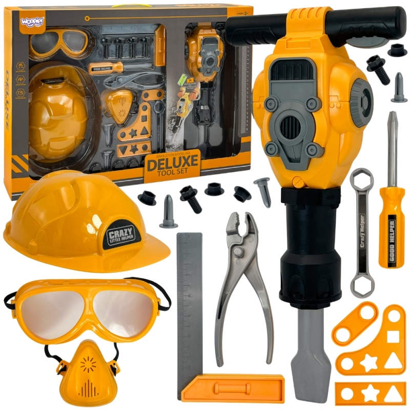 Zestaw Narzędzi Małego Majsterkowicza marki WOOPIE to kompletny zestaw narzędzi do zabawy w budowę: kask, okulary ochronne, realistyczny młot pneumatyczny zasilany bateriami oraz narzędzia i elementy konstrukcyjne pobudzają wyobraźnię i zachęcają do twórczej zabawy w majsterkowanie. Realistyczne efekty zabawek oraz solidne dodają autentyczności i zapewniają długie godziny zabawy.