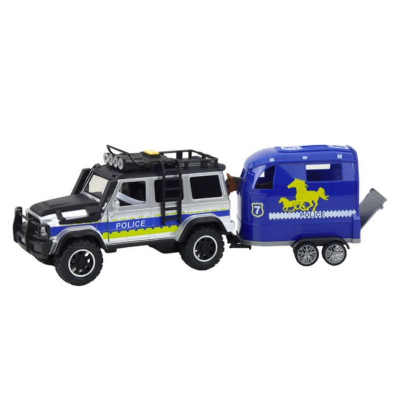 Wyrusz na emocjonującą akcję policyjną z realistycznym zestawem samochodu terenowego i przyczepy do przewozu koni od marki WOOPIE! Czarno-niebieski pojazd wykonany z wysokiej jakości tworzywa zachwyca szczegółami i dbałością o detale. Efekty świetlne i dźwiękowe sprawiają, że zabawa nabiera prawdziwego charakteru służb specjalnych. Otwierane drzwi oraz odpinana przyczepa pozwalają na tworzenie niezliczonych scenariuszy zabawy. To idealny zestaw dla małych fanów policji, motoryzacji i kreatywnej zabawy w akcje ratunkowe!