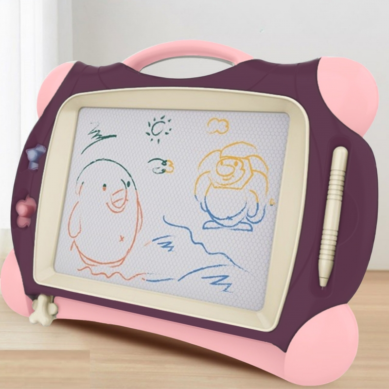 Znikopis Tablica Magnetyczna daje możliwość kreatywnej zabawy na długi czas! Tablica zachęca do pisania i rysowania. Rysowanie pozwoli wyciszyć i uspokoić się Twojemu dziecko. Znikopis pozwala na tworzenie nieskończonej ilość obrazków – wystarczy przejechać specjalnym suwakiem, a rysunek zniknie i można rysować od nowa! Zestaw dodatkowo zawiera wygodny magiczny długopis oraz 2 stempelki, które urozmaicą dzieło. Tablica posiada wygodny uchwyt, dzięki czemu dziecko może zabrać ją wszędzie. Znikopis rozwinie u dziecka zdolności manualne, wyobraźnie, kreatywność oraz da szansę na rozwinięcie artystycznej strony dziecka!