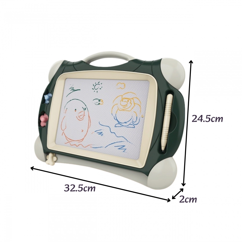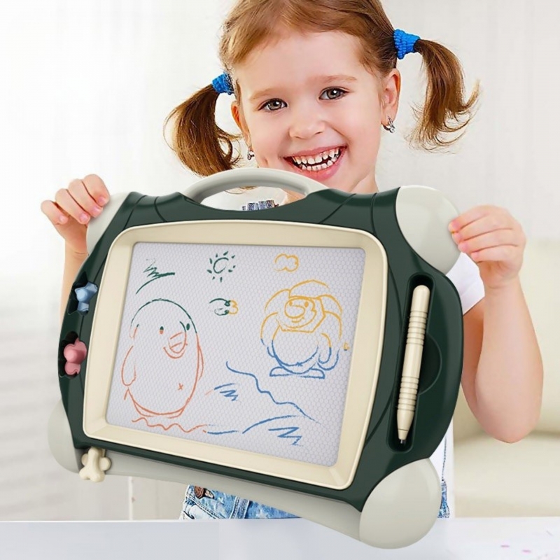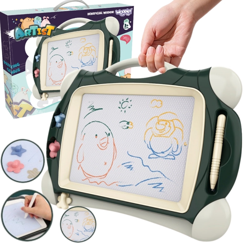 Znikopis Tablica Magnetyczna daje możliwość kreatywnej zabawy na długi czas! Tablica zachęca do pisania i rysowania. Rysowanie pozwoli wyciszyć i uspokoić się Twojemu dziecku. Znikopis pozwala na tworzenie nieskończonej ilość obrazków – wystarczy przejechać specjalnym suwakiem, a rysunek zniknie i można rysować od nowa! Zestaw zawiera wygodny magiczny długopis oraz 2 stempelki, które urozmaicą dzieło. Tablica posiada wygodny uchwyt, dzięki czemu dziecko może zabrać ją wszędzie. Znikopis rozwinie u dziecka zdolności manualne, wyobraźnie, kreatywność oraz pomoże w rozwinięciu artystycznej strony dziecka!